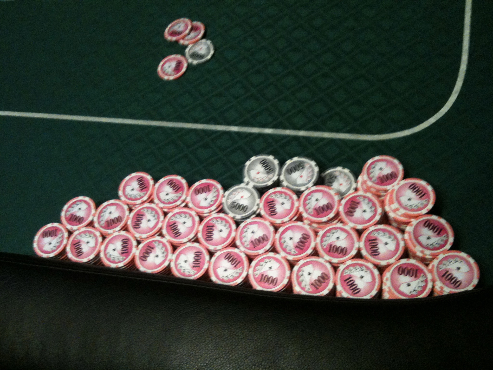 This table is sort of like a blur at this point. I had one of the bigger stacks at the table and just slowly grew things. Mr. Loud was seated in 6, across from me again, yammering on about how I was going to double up his chip stack. He almost seemed to lick his lips when I went to showdown holding 3 4 on a flush draw with a player from the other end of the table for about 5K. He and a loud guy who’s a regular seated in 4 were harassing seat 1, who was partially blind. When seat 4 asked him what he thought he was doing at one point, he mentioned he had a hard time seeing, got a quick apology, then the harassment continued. He was busted not long after and left with a sarcastic “Thanks for making the evening fun.” The pair focused their attention on me at one point, when Mr. Loud called me “son” and I said that I was probably a good bit older than he was. Loud, Jr. started in about how Loud had seen way more hands than I ever had (probably true). The bravado was pretty ludicrous considering that my stack was several times larger.It’s not the quantity of the hands that counts.