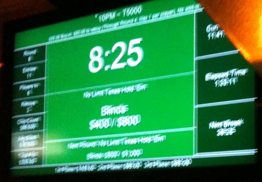Not a big crowd but just a hideous downpour while we were mostly five-handed on two tables. I laid down twice to the same player’s all-in, with him showing total air both times. Didn’t get a chance to put him to the test before I was eliminated with 8X 8X v AX AX.