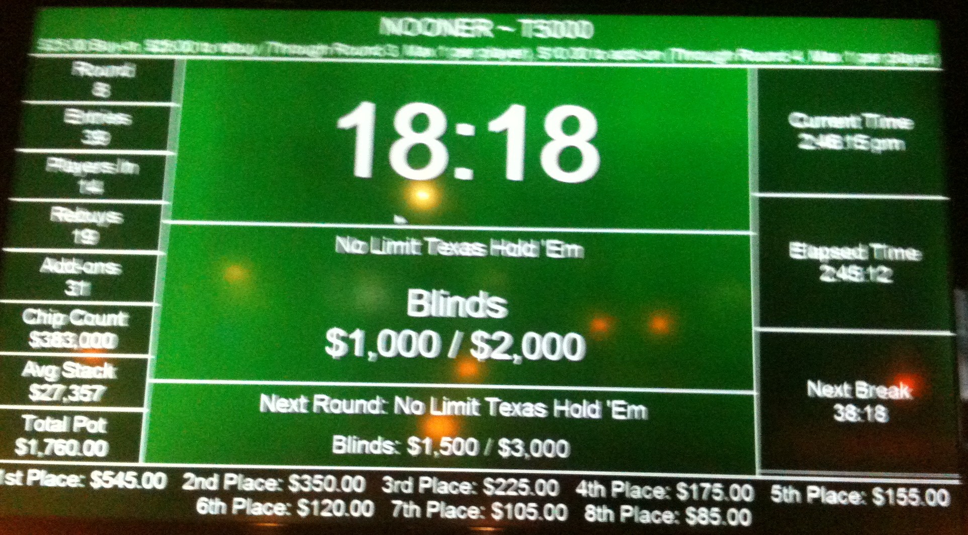 Finally sat down for lunch with MH, who I’d met at Aces originally last spring, passing around comparisons of the blind structure progressions of the big summer tournament series in Las Vegas. I hadn’t meant to play anything today, but since I’d won a game last night, his talk of playing the noon game at Aces was appealing.