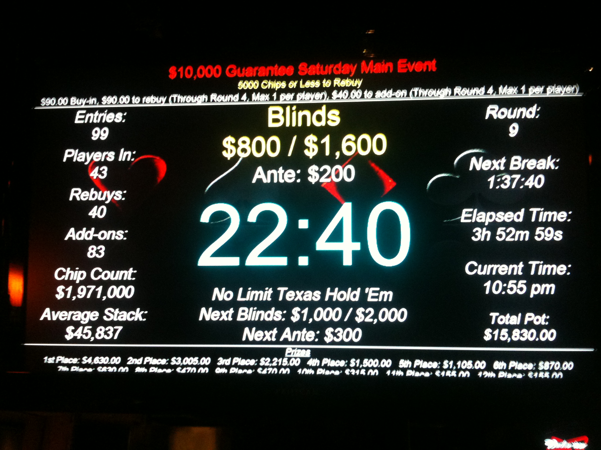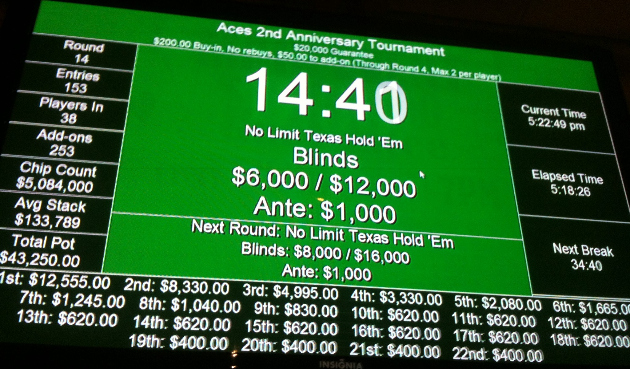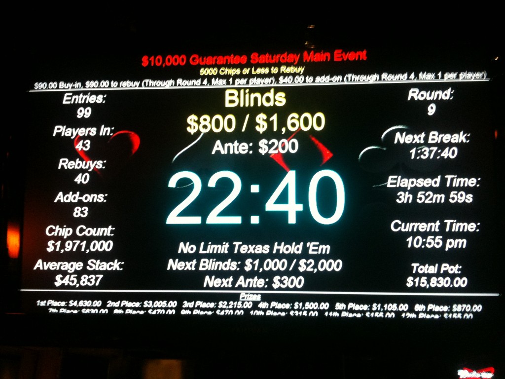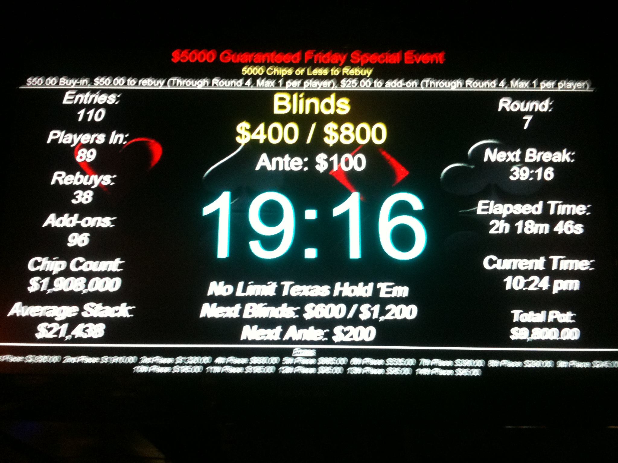 I stayed pretty quiet through the next half-hour; at the ninety minute mark I hadn’t won any more but I was still holding at 40,300. The final stats were in for the game: 153 entries, 148 players still in, 253 add-ons (both pre-game and at break), and a total pot of $43,250.