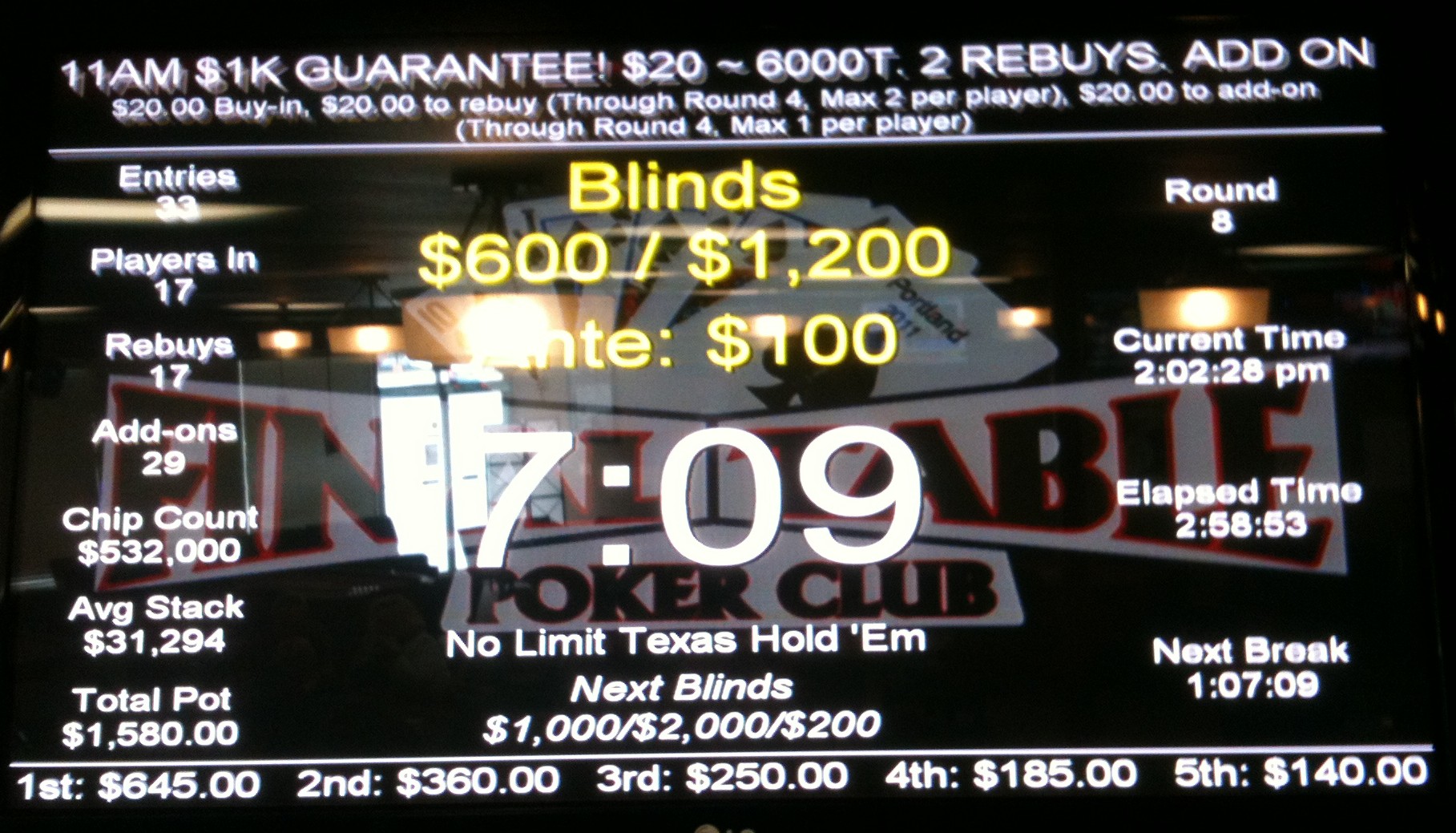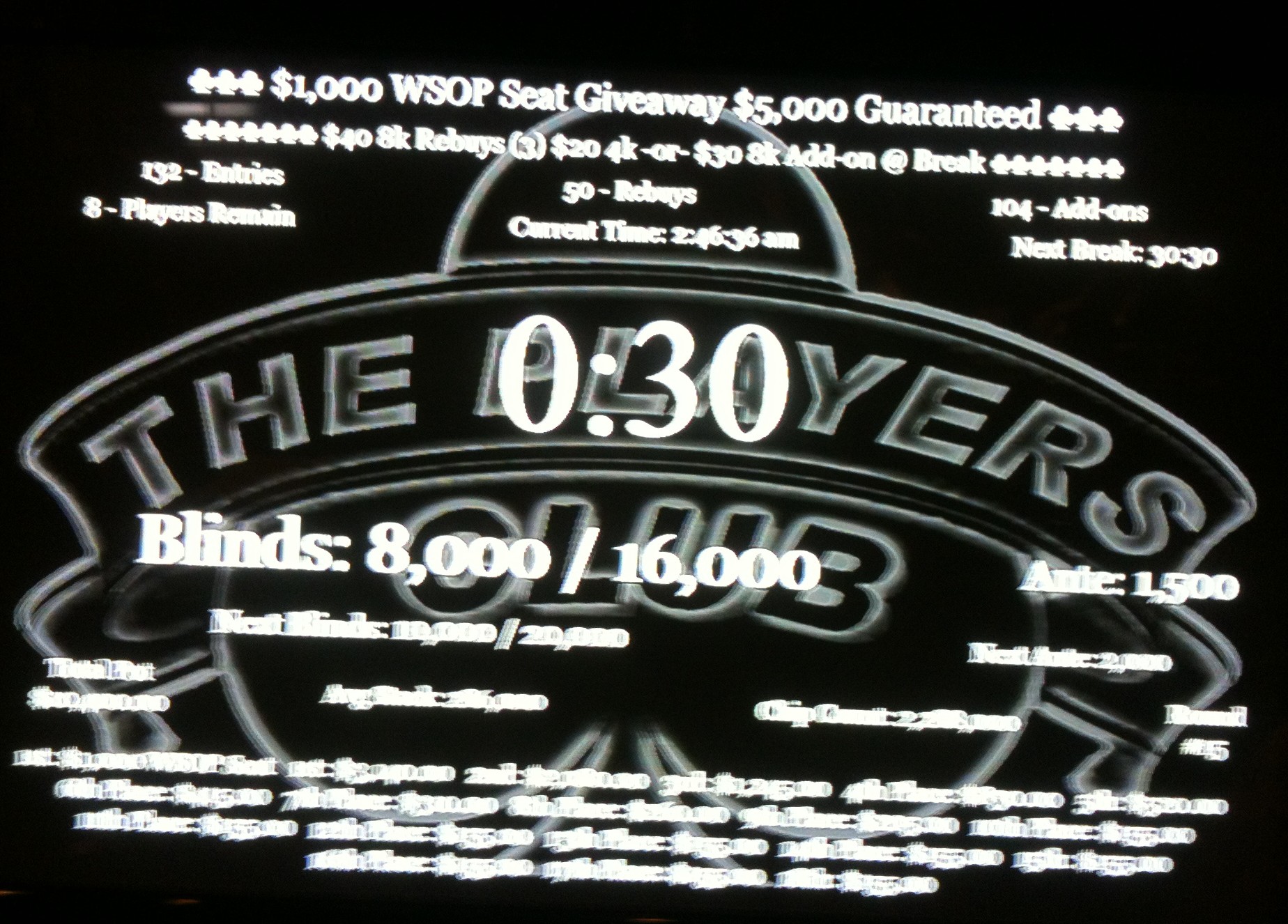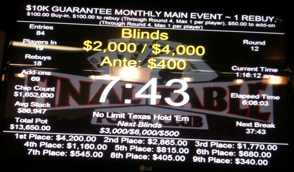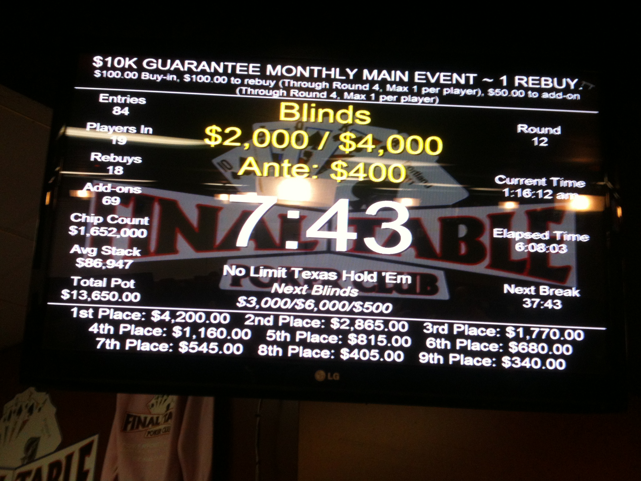 I stayed pretty quiet through the next half-hour; at the ninety minute mark I hadn’t won any more but I was still holding at 40,300. The final stats were in for the game: 153 entries, 148 players still in, 253 add-ons (both pre-game and at break), and a total pot of $43,250.