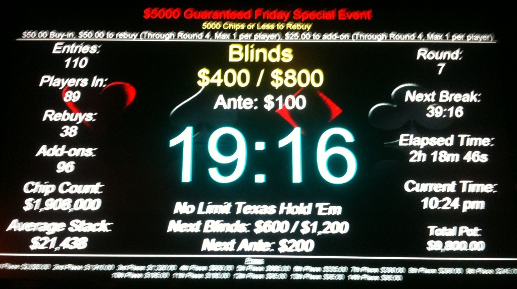 One hour and forty-five minute into the game and I’m up to a healthy T30,575, more than 40% above the chip average. Five minutes later, I’m buying the add-on of T8,000 chips. There are 84 entries, with 18 re-buys. The break sees 69 add-ons and the pot’s $13,650, with 13 places paying. 77 players left at the break.