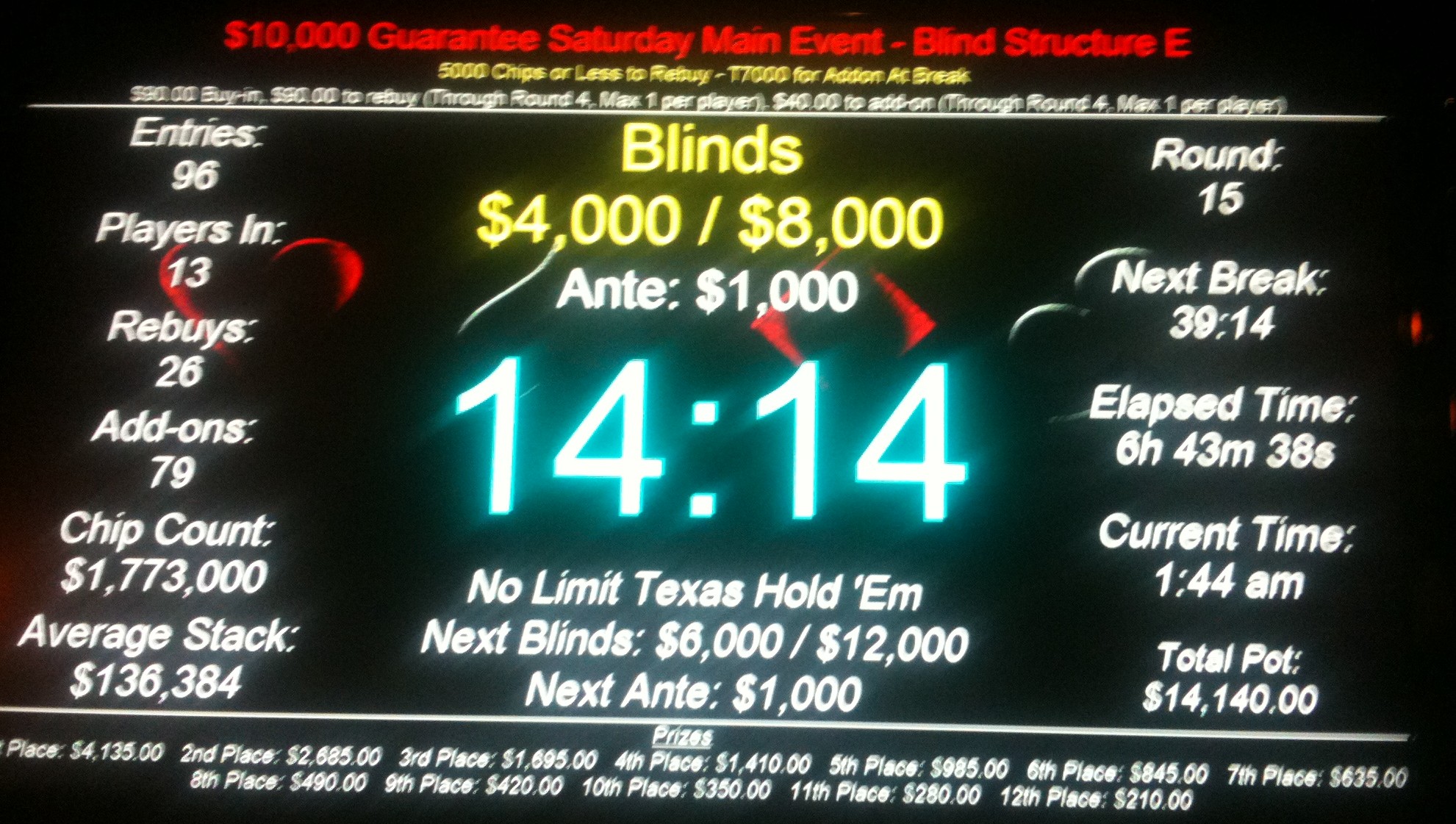 By three-and-a-half hours in, I was up to T75,000 after another knockout. Fifteen minutes later, with just over half the field of 96 gone, I had an even T84000; more than twice the chip average and a little more than half what I figured the average chip stack would be at the 12-player payout level.