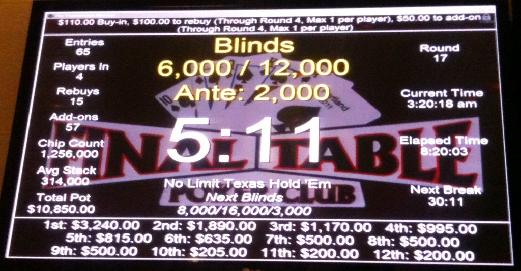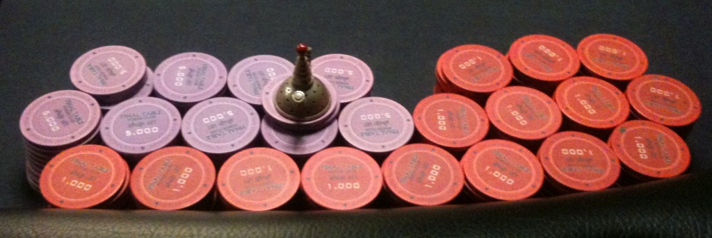 It’s been a couple of frustrating months since the high of the Vegas cashes and the Chinook Winds event. Apart from a fourth place finish at a Final Table $10K, there were the busts at the Wildhorse and Rincon WSOP Circuit series, and nothing significant until last Friday’s Final Table $10K, when I got to short-handed play with a decent stack and had half the chips in play by the time it was down to four.