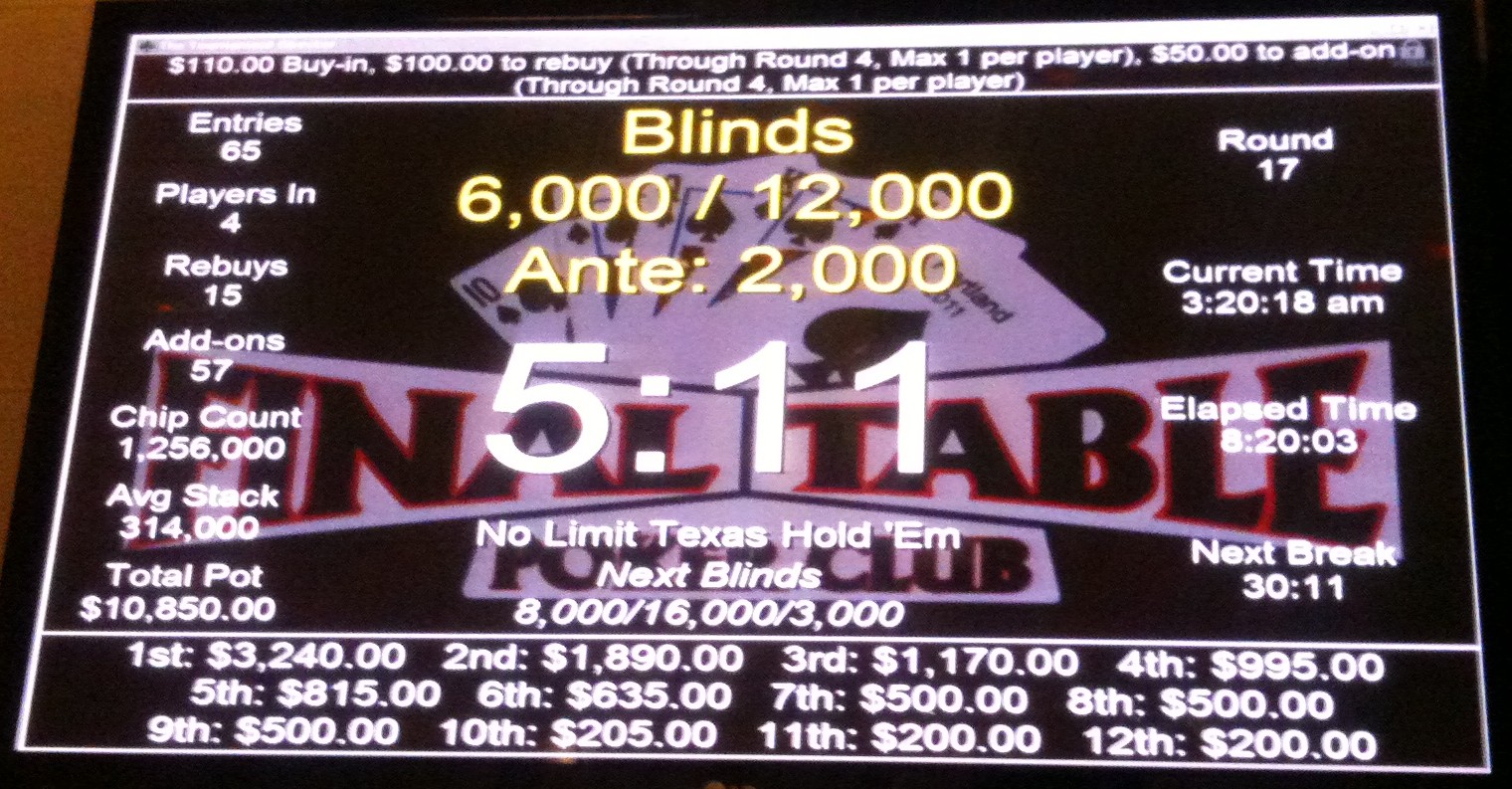 Big games in Portland this next weekend, as Final Table holds its “Fifth Friday” $20K tournament, and Encore Club has Portland’s first $40K of the year. Hoping to do well enough to finance a little expedition to Vegas and LA at the end of this next month.