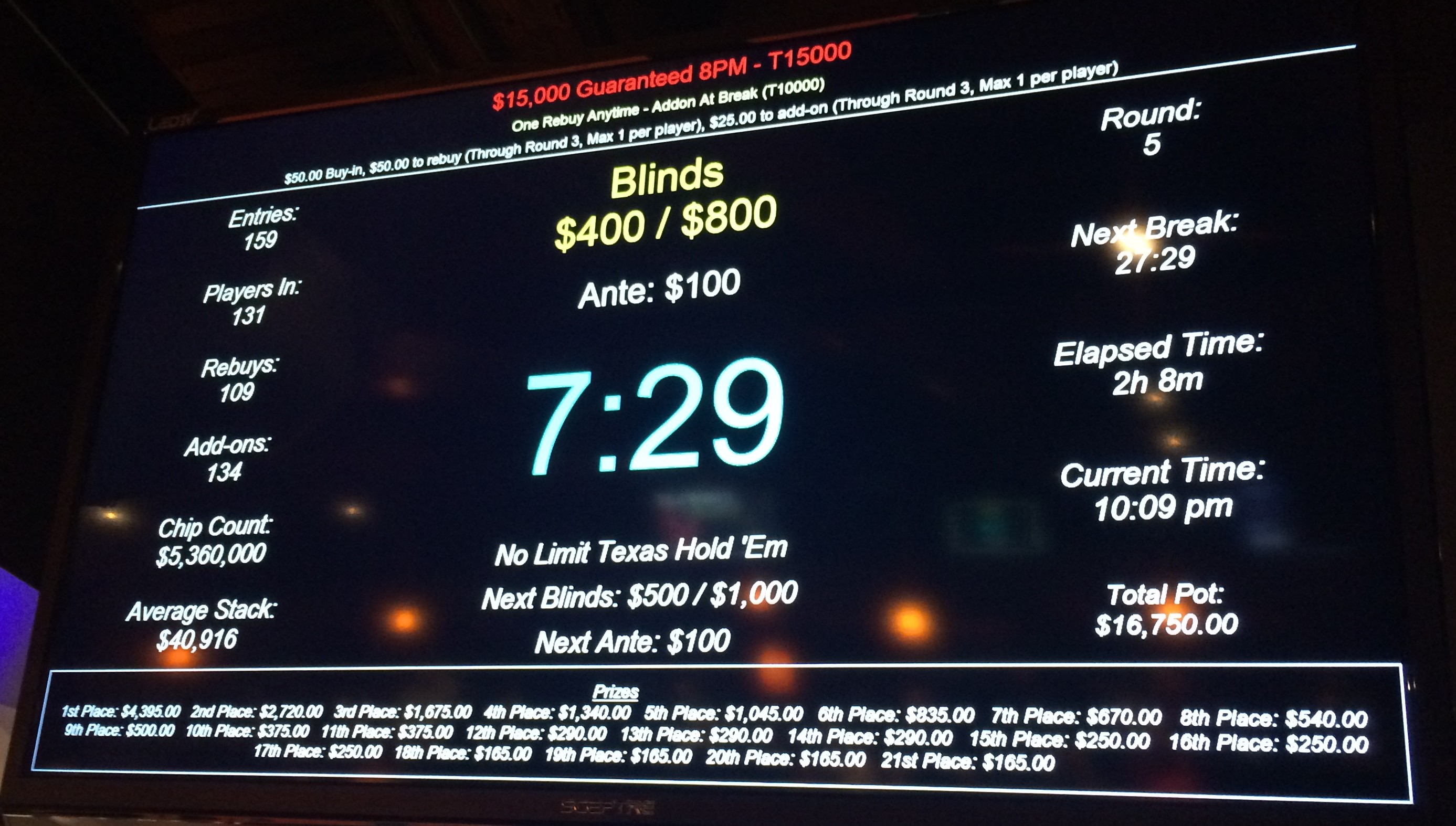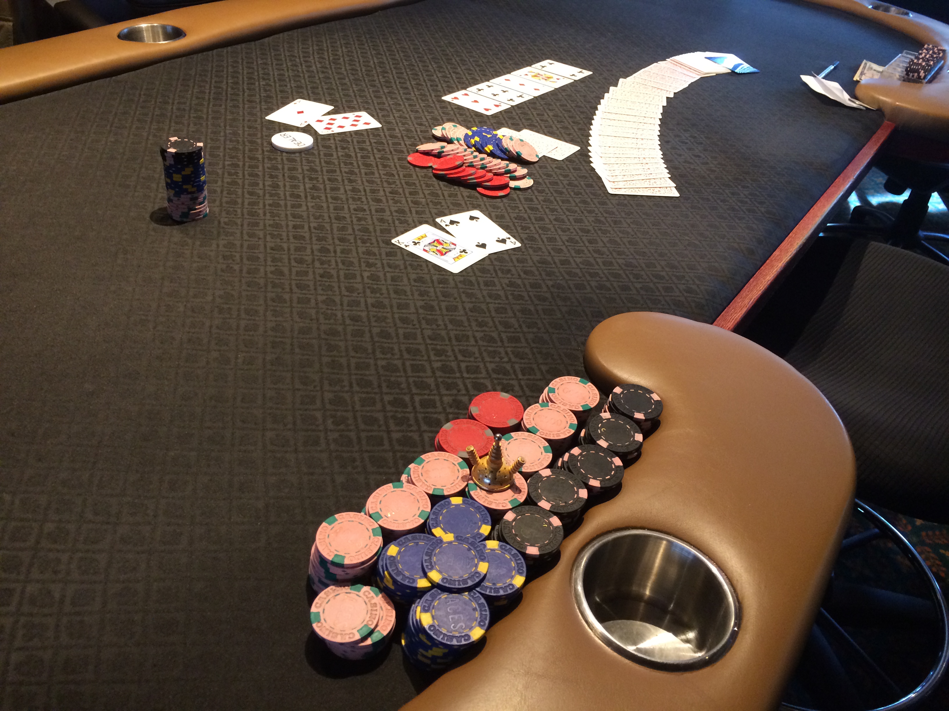 I didn’t get much early in the game, made a few calls and folds in the first 45 minutes and I was down 1,000 (blinds started at 100/100 with 25-minute rounds).