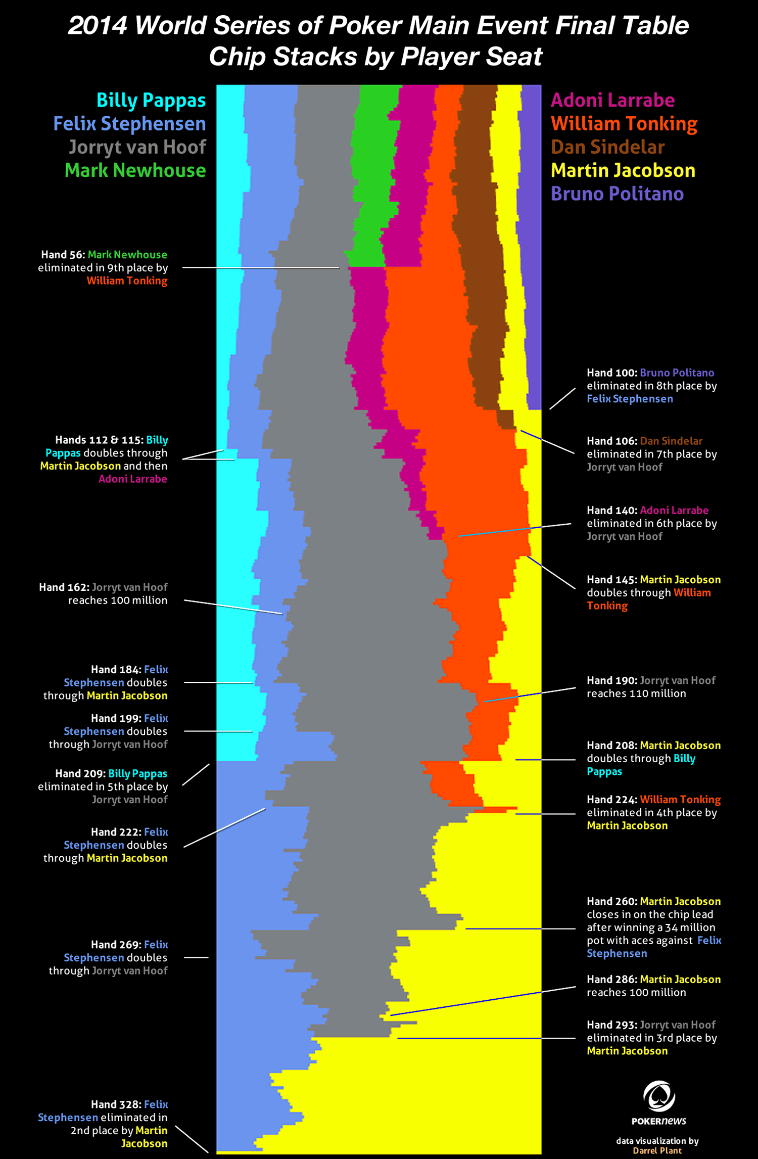 I don’t know that I’ve ever looked at my VPIP in PLO8. A full 50% in this tournament. I won at least a portion of the pot in 27 hands, 60% of the hands I played and a full 30% of the hands in the entire tournament. 21 of my played hands went to showdown (47%). I won a portion of the pot in 17 of the 21 showdowns (81%). Eight of the 17 showdown wins were scoops (47%), I took 3/4 of the pot in one showdown, and the other eight showdowns won were split evenly between high and low pots.