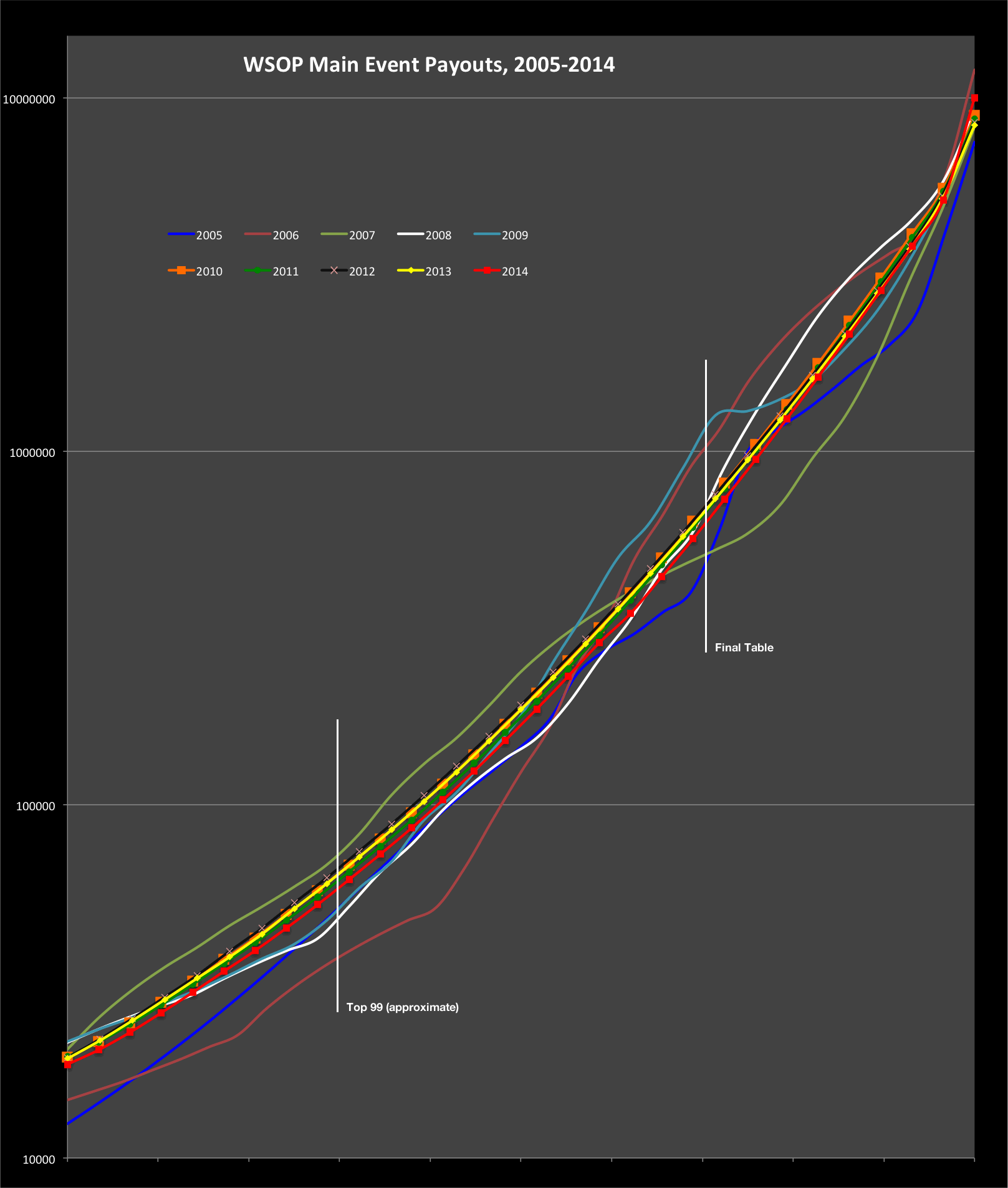 While the difference between the 10.37% of entries paid out in 2014 and 9.98% paid in 2009 may not seem that large, that’s 25 more players making it past the bubble than would have before changes to the payout formula were made in 2010. The real change for most players isn’t the $10 million guarantee for first knocking down the amounts paid to everyone else, it’s been an increase in the minimum payouts first implemented in 2007, and a smoothing of the payout curve put in place in 2010.