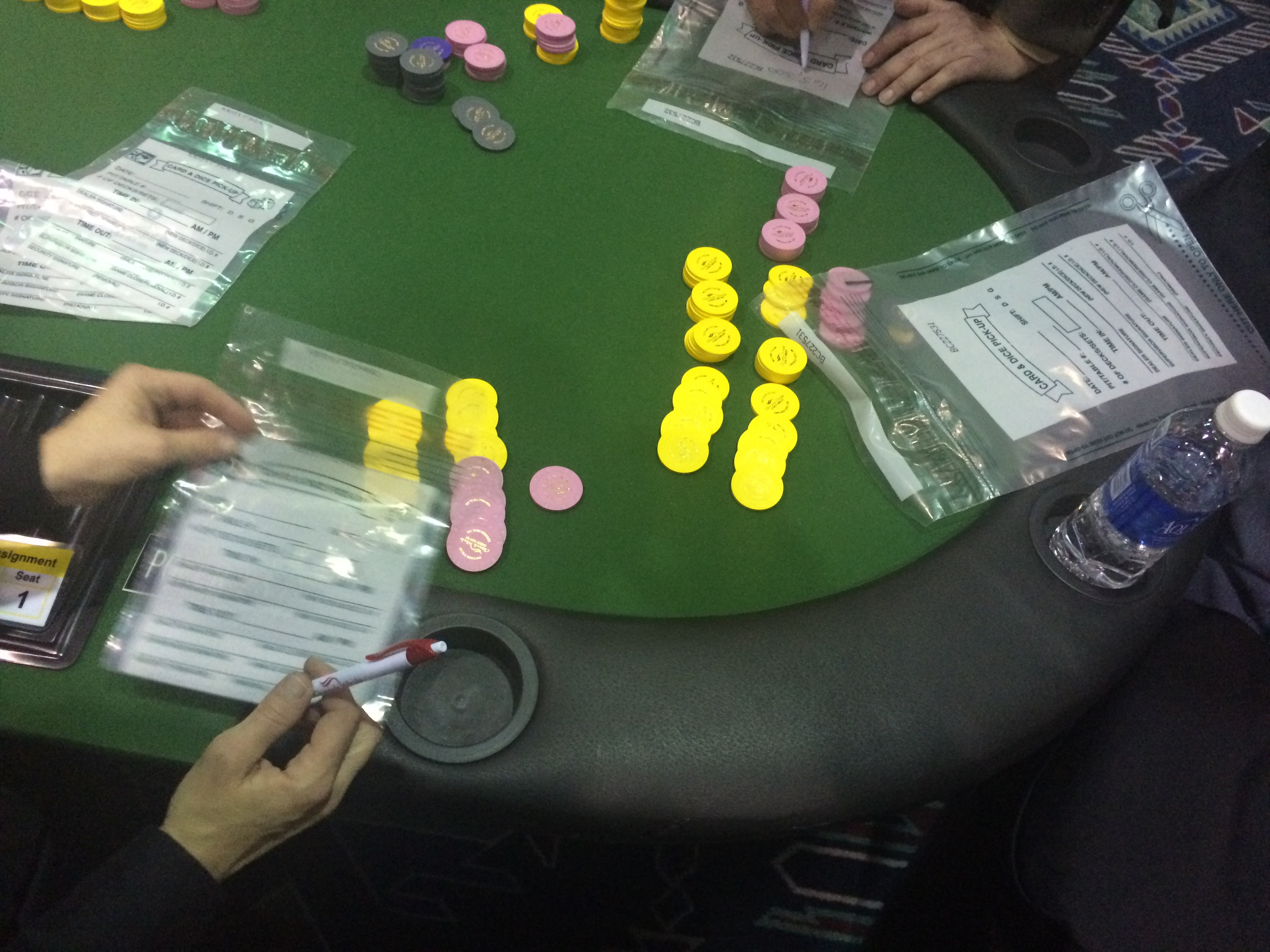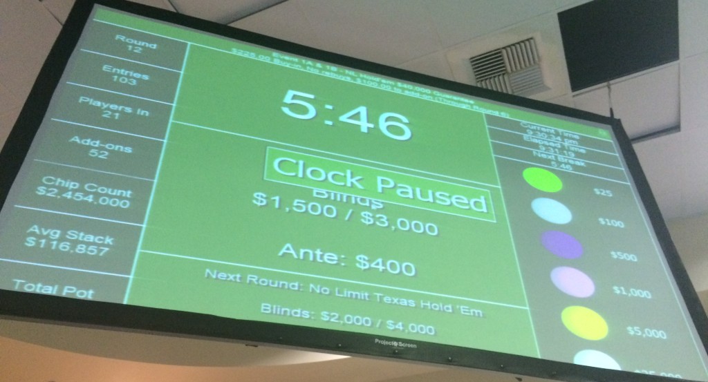 We’d finished Day 1A with about six minutes to go in Level 12, with a scheduled break and race-off of the 100 chips before starting Level 13 at 2K/4K with 500 antes. The button started in seat 8, and I was in seat 3, so I was grateful that the first four hands zipped through before the end of the level, because I was able to get through the blinds before they increased. I shoved my SB against seat 4, who had barely more than I did, so I was actually up a few chips by the color-up. Since we’d just started, we moved into the next level after the chips were raced off.