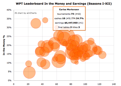 The interactive chart below maps those players by ITM and number of WPT entries. Each bubble represents a player, with the size of the player’s bubble relative to their WPT earnings over the first twelve seasons (bubble sizes are not proportional to winnings, but the larger the bubble the more money won). Rollovers show the five leaderboard items and rankings for tournaments played, cashes, and earnings (there’s not enough differentiation in final tables and titles to make rankings worthwhile).