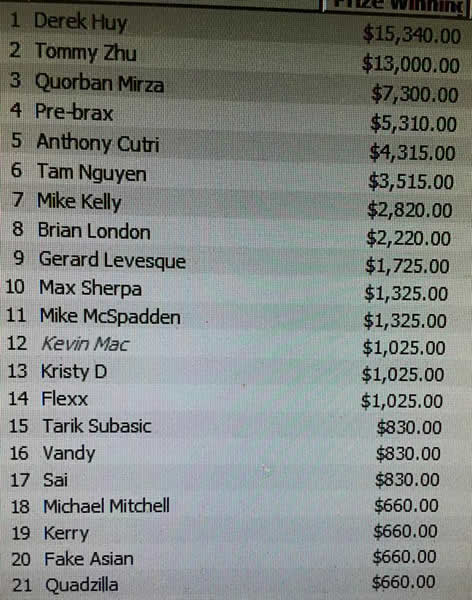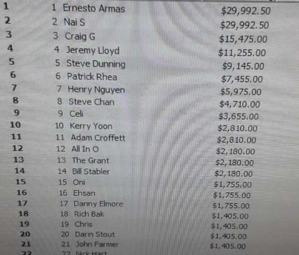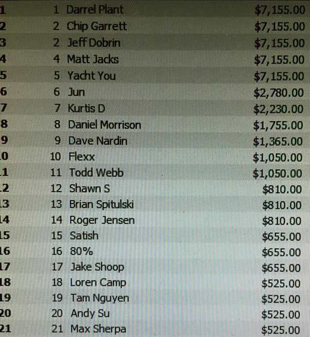 Meanwhile, over at the Venetian, Jaque Lavadour and Angela Jordison were collecting bounties and making final tables in a couple of events. Steve Myers survived several crippling setbacks to take 12th in a $250 buy-in, $150K guarantee event with more than 800 entries.
