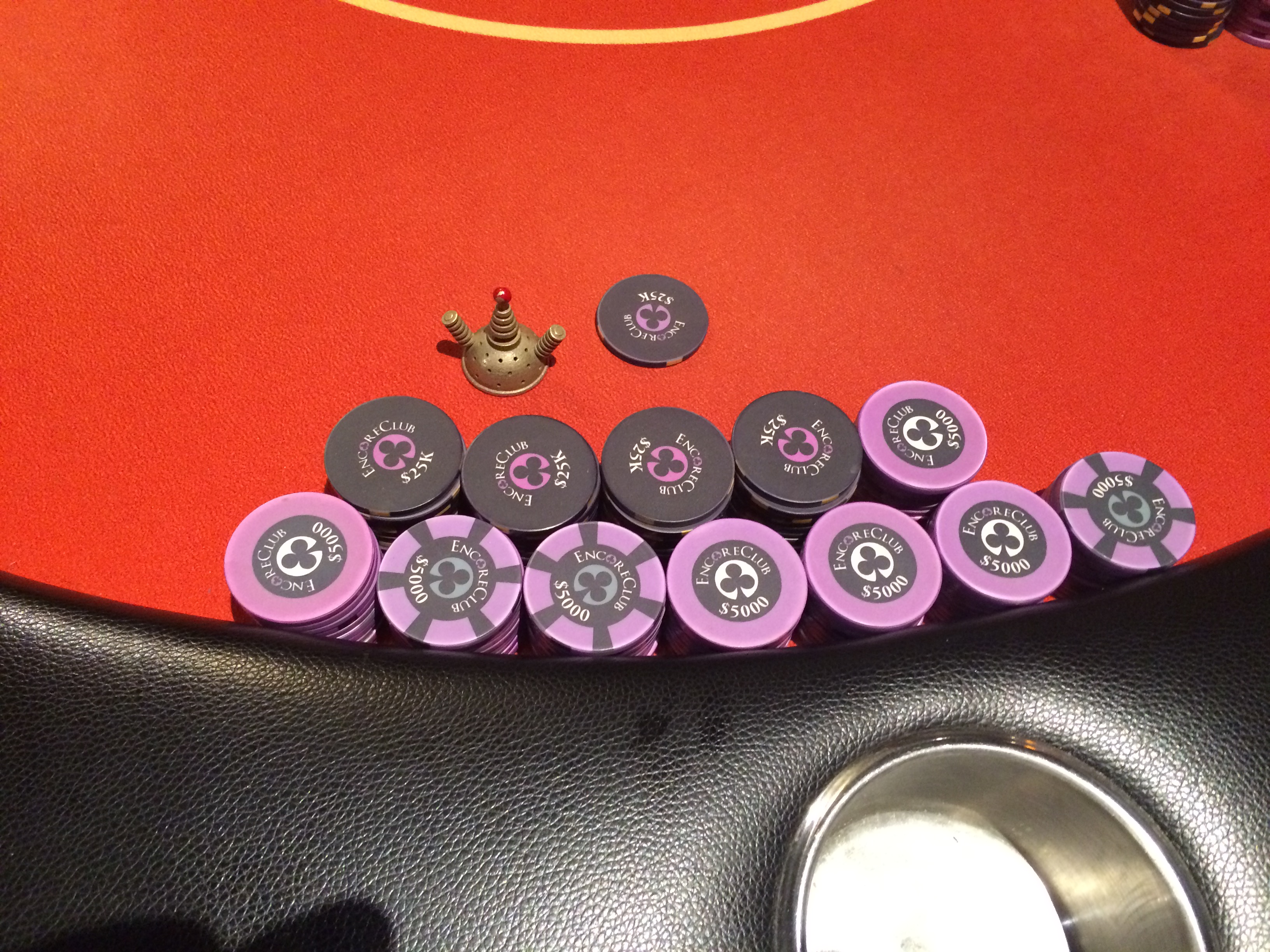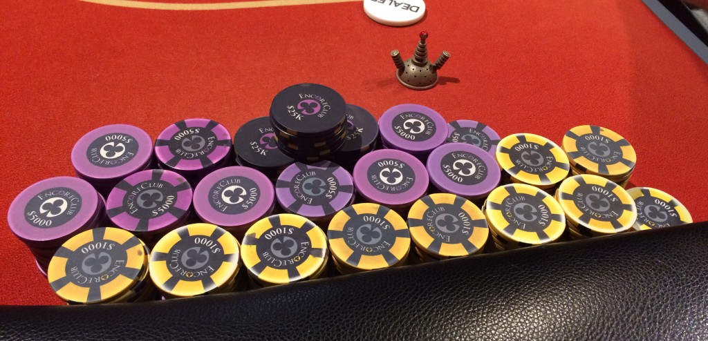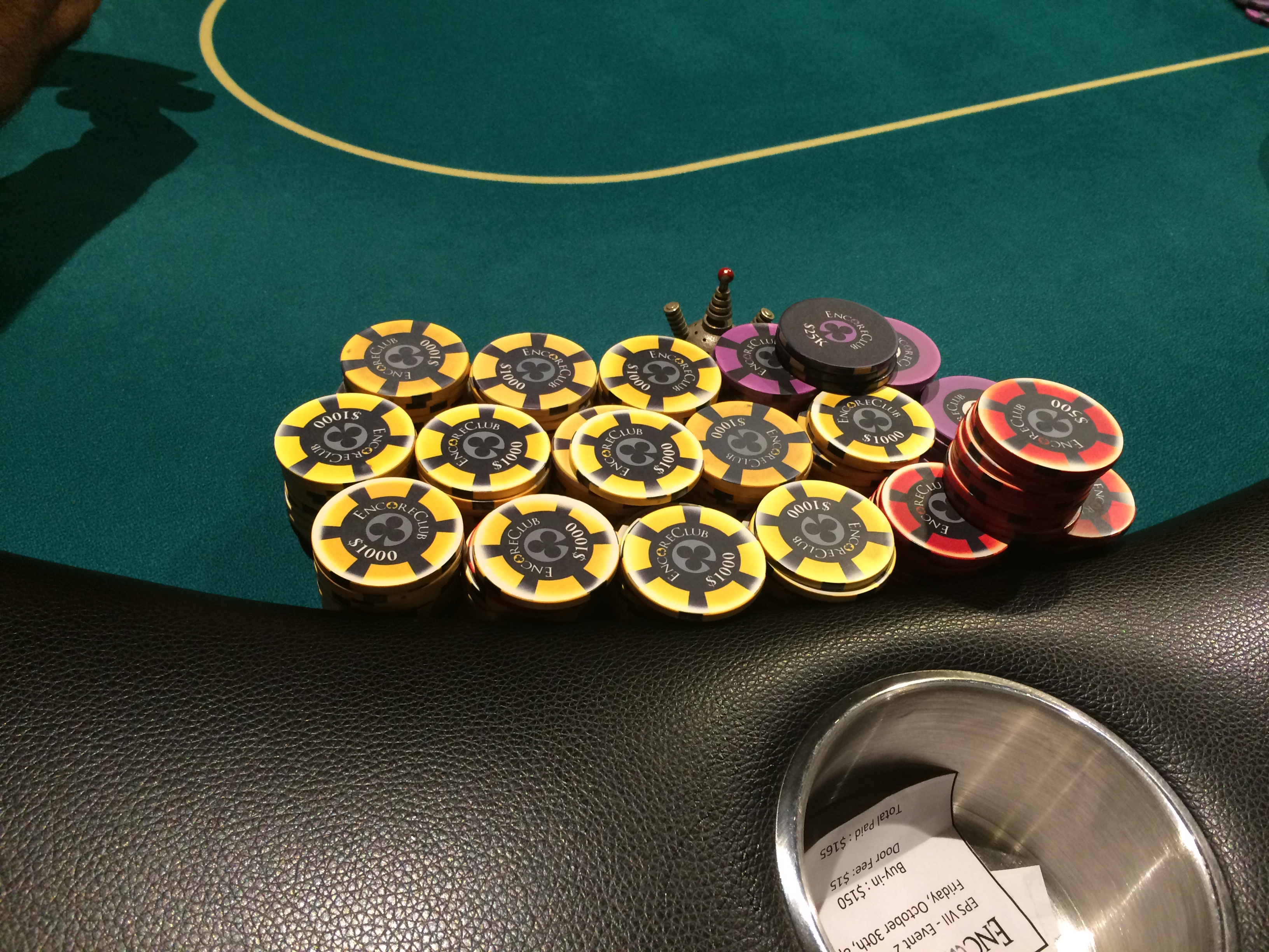 - The big game in town this week is Encore Club’s $35K guarantee, Saturday at 1pm. 35-minute levels and a 20K starting stack for your $200 buy-in. Re-entry and late registration though the end of the first break (about 3:40pm), but this game will likely have a waitlist, so I wouldn’t plan on late-regging unless you’ve got a backup. An $80 add-on at the break gets you another 15K in chips. Expect this to be another day with $15 door fees, so bring that extra fiver. Tickets are on sale now. No indication on their home page if Encore will be closed Thanksgiving.
