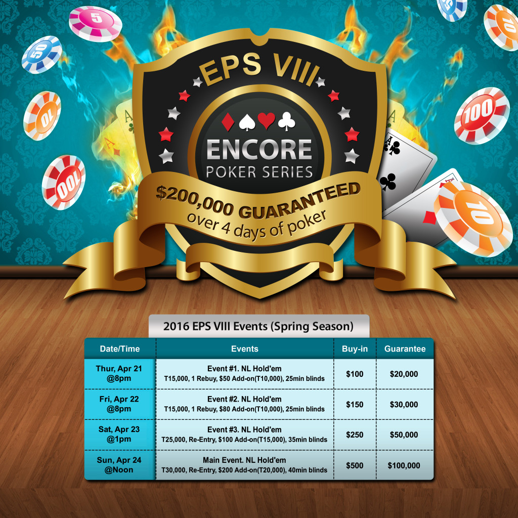 Encore Club’s now-monthly $35K is scheduled for Saturday 16 April. It’s closely followed by the Encore Poker Series VIII, four events with $20K, $30K, $50K and $100K guarantees on 21—24 April.