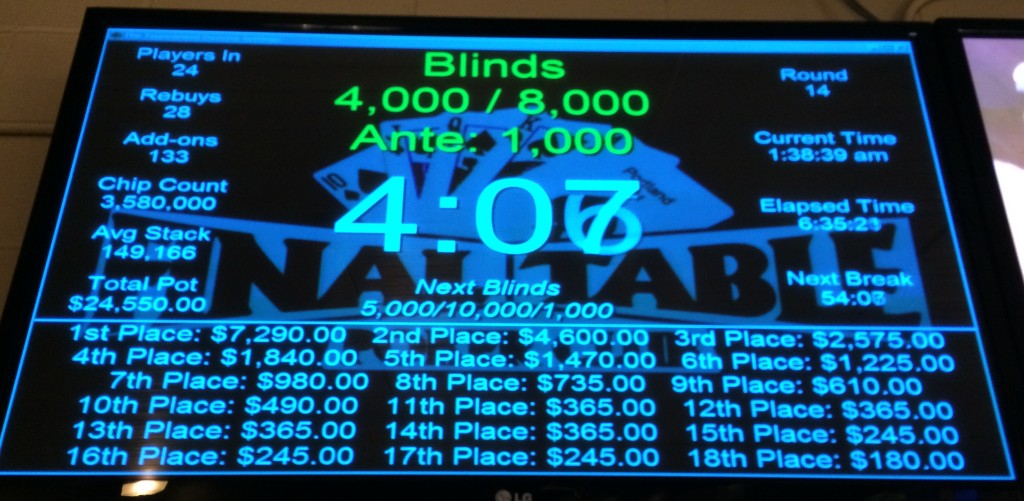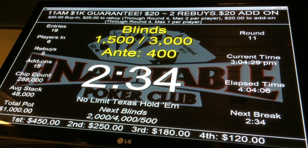 That pretty much goes out the window this month. With the number of large events going on in Portland alone (see last week’s April Is the Pokerest Month), unless you’re in Las Vegas, LA, or—God help you—Edmonton for some other reason, there’s not much of a reason to leave town for poker value. Just the announced events (Final Table $20K and $100K, $200K of events during the Encore Poker Series and a $35K) are worth hanging around for—I’ve gotten a couple of inquiries from people coming from out-of-town to play—and it’s a certainty that there are going to be the type of last-minute announcements that I don’t get in time for the calendar that just drive me crazy!!!!! Stop putting every special event on Wednesday and Saturday, guys!