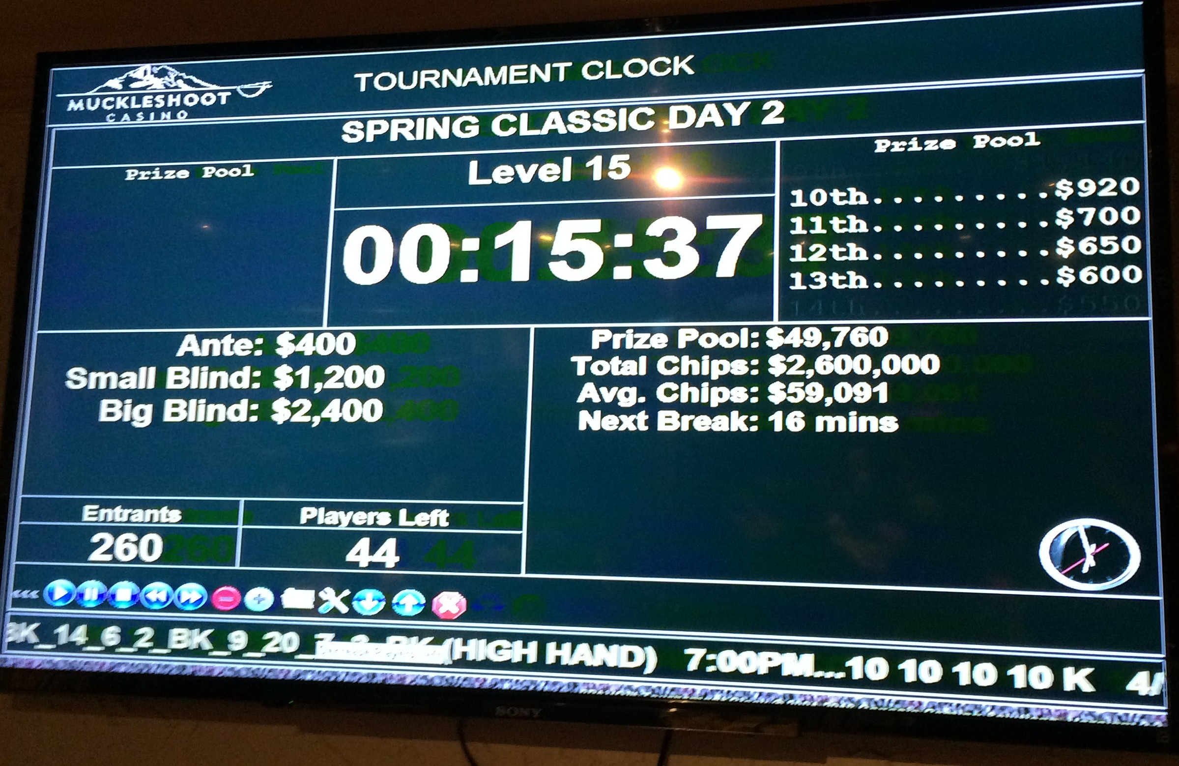 Tonight at 7pm is a $125 satellite for the Muckleshoot Spring Poker Classic. In the past, these early satellites have been for multiple events, since the actual events are $200, $250, $300, $500, and $750. Monday and Tuesday at 7pm are $225 satellites, which may be for the entire series. The first event is a $250 Shootout (an actual shootout, not a Portland shootout) next Wednesday at noon. The other events are standard NLHE tournaments: $200 on Thursday (3/17), $300 on Friday, $500 on Saturday, and $750 for the two-day Main Event beginning Sunday (3/20).