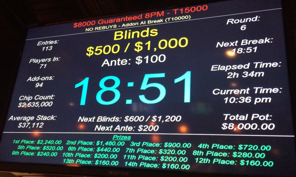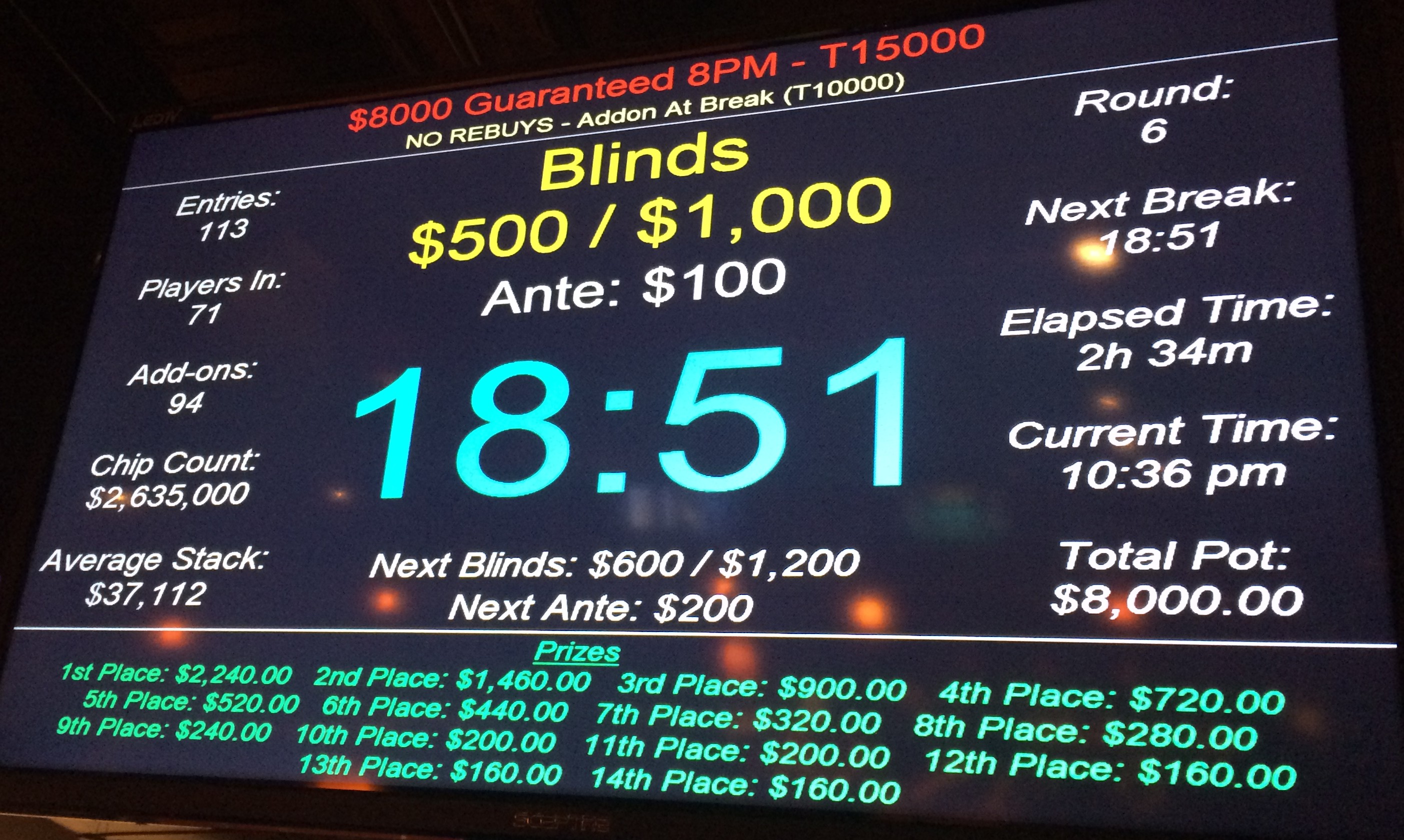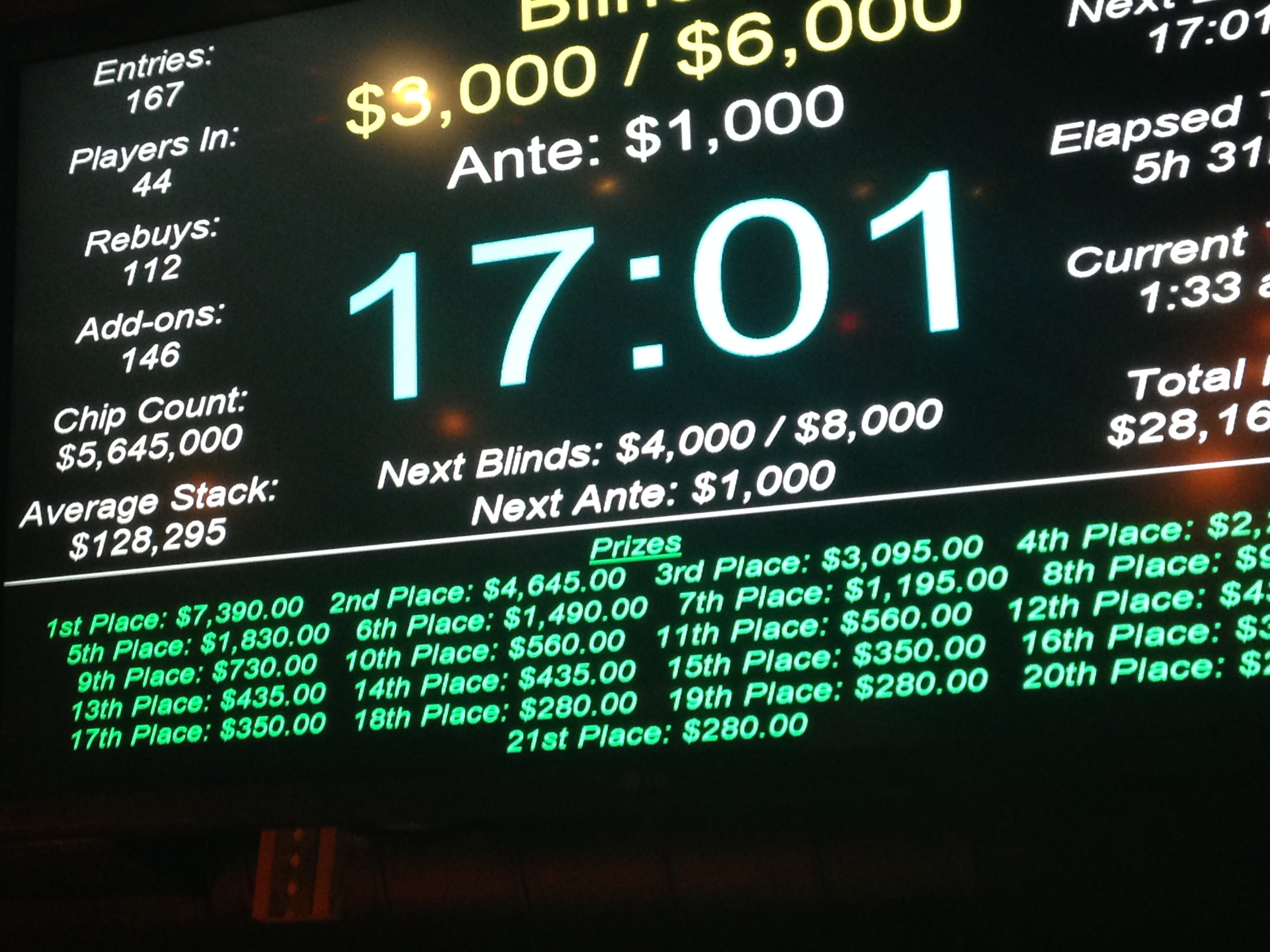 For comparison, here’s (part of) the screen from Encore at a similar point in the tournament. I apologize for the crop, I didn’t take it but some of the screens are difficult to shoot when there are players in front of them. Average buy-in at Final Table was $162; at Encore it was $169. Average share of the pot at Final Table (including overlay) was $175, for an 8% immediate +EV.