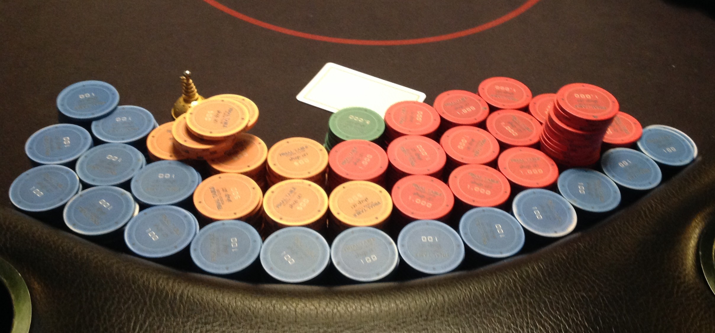 Back in the old days of the blog (and every now and then more recently), I used to note my hands in live games and write them up. Matthew, one of the dealers at Final Table mentioned it during the game, for which I want to give him a shout-out. It’s tough to do live. It takes away from your ability to concentrate on the hands you’re not involved in, but my memory’s never been eidetic. I like to tell people it’s hard to get a read on me because I can’t remember what my cards were five seconds after I looked at them. If I don’t not down details of a hand, likely as not I’ll forget about it. But I brought out MomentDiary for the First Friday $20K. Not every hand will have all the details—this isn’t an online hand history—but I got a lot of what happened. Hand numbers aren’t absolute, as bustouts and changing numbers of players at the table make things difficult to reconstruct exactly.