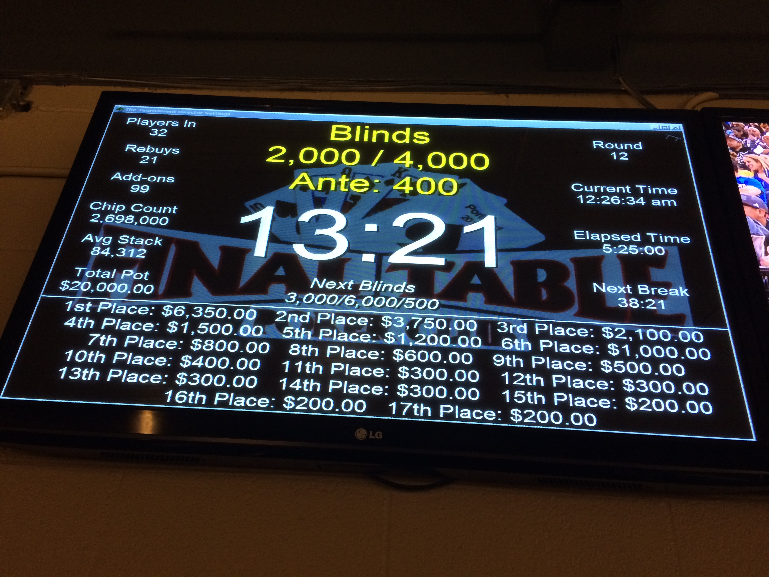 Had to do a rebuy, but then the cards started coming. I hit set after set, and by the first break I was up to 50K, so I didn’t do the add-on.