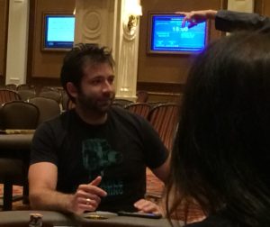 Back up at 9:30 or so. Write the Day 3 intro (our guidelines say they’re supposed to be written the night before, but so far that hasn’t happened for me), then into the fray. We had two tables in an otherwise empty quarter of the Amazon Room to start with. The reporting desk was on the far side of the section, a “problem” Martin would sneer at. Then two minutes before the tournament was to start, the floorperson told players to put their chips back in their bags and ran them all the way across the room. My fellow reporter and I had to grab our computers and hurry to catch up, because we were fairly certain one of the players was going to bust on one of the first hands, since he came back for the day with just a single big bet.