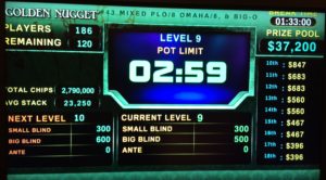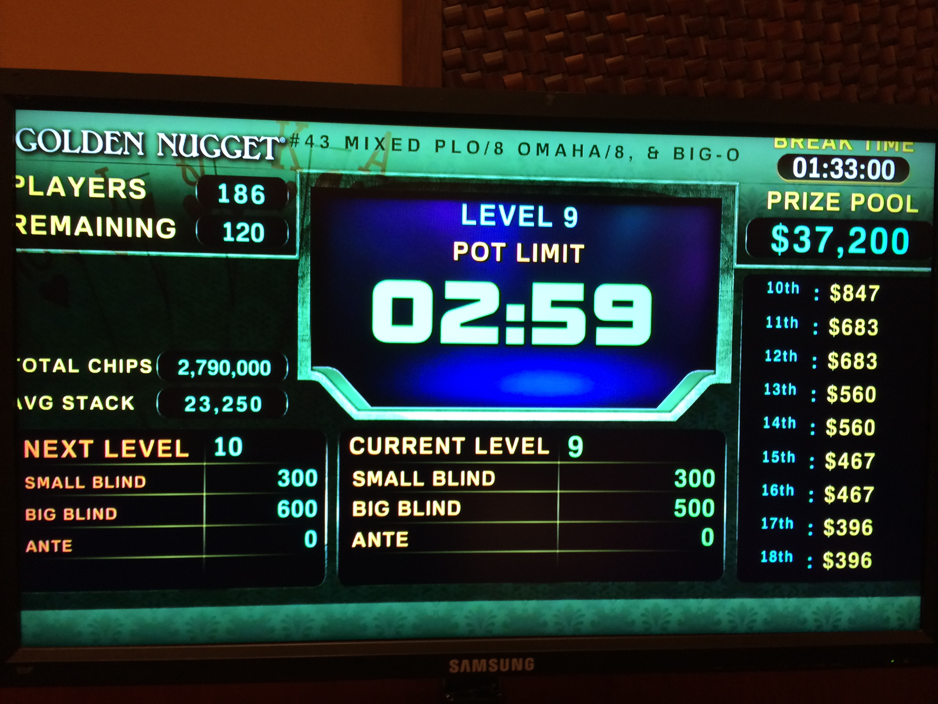 Played 0.5/1 PLO8 on for a total of about 20 minutes and blew 100bb and went to the Golden Nugget to try out the PLO8/O8/Big O format that I’ll be covering starting today (assuming I get this post up on time). Had a couple of good hands, but busted out after about four-and-a-half hours.