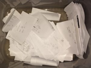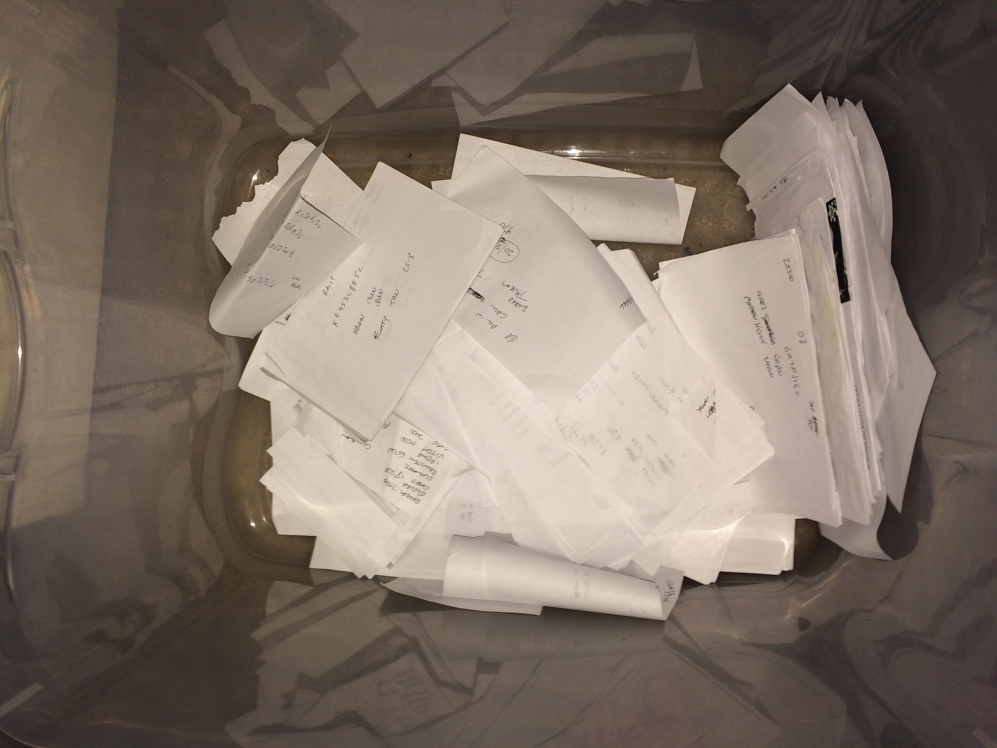 Action ended at about midnight and we scurried around to all of the tables to get the chip tallies of the last 23 (of 731) players. A bit of confusion when we were trying to figure out the count for a player we appeared to have missed. I had a name that was completely different from the missing player, and another reporter had made the same mistake transcribing their last name. Not writing it down wrong like me, but writing it down wrong exactly the same as I had. We sorted it out.