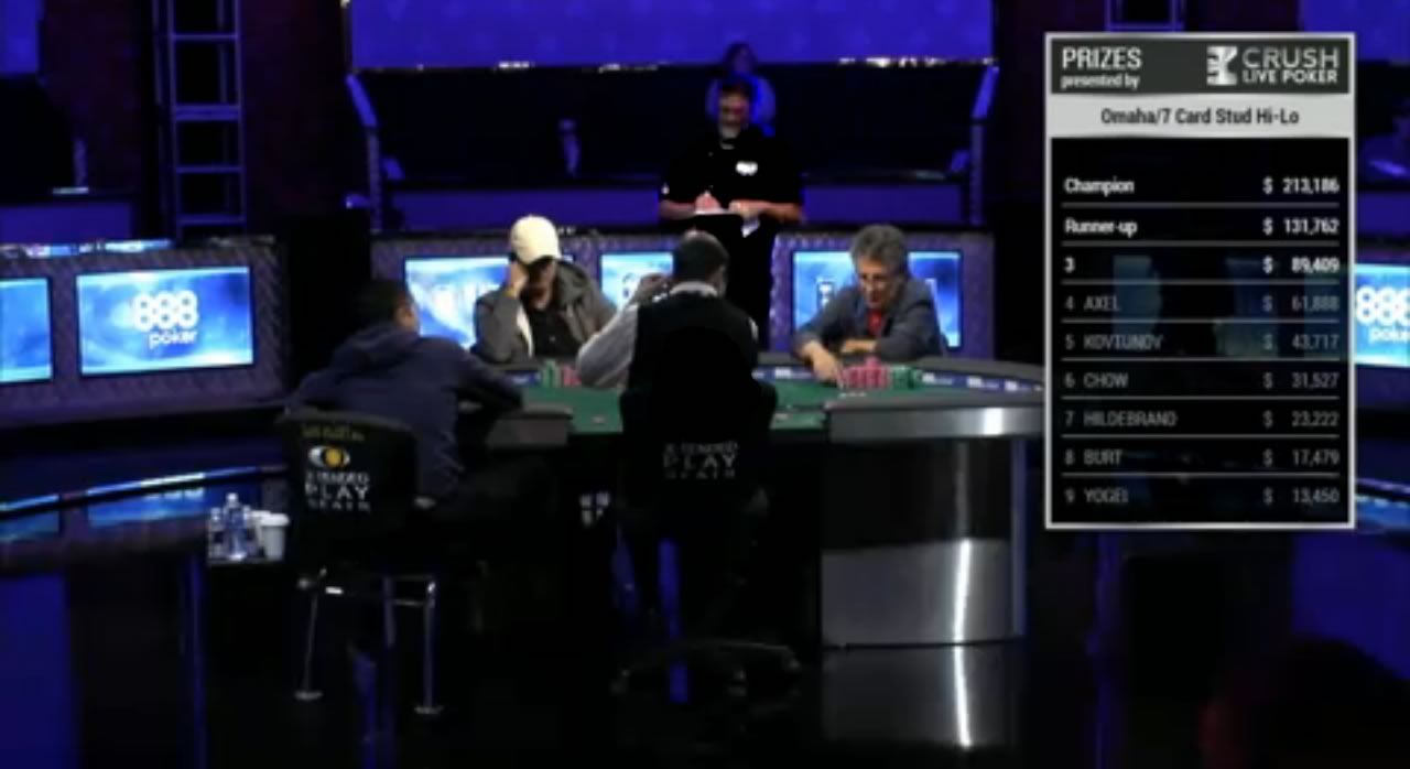 Let me just note: keeping track of actions and cards in limit split-pot games is not an easy task. For one thing, there are a lot more cards exposed in stud and Omaha games to start with. Sometimes it’s difficult for players to see what’s out there, and as live reporters, we’re supposed to be as unobtrusive as possible, so despite the occasional stink-eye from players who think we’re crowding them, we really are trying to give them room. And it’s just not all that clear sometimes where the chips are going, who got the high, who got a low, if there’s a quarter, etc. I do my best for someone with crappy handwriting.