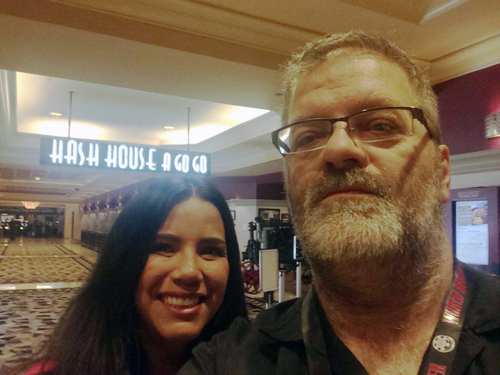 Since I woke up early, I got myself together and headed to the Rio. The early bird gets the nearby parking spot. The MutantMobile (aka a baller 1998 Ford Escort wagon). I set up my stuff in the live reporting office and saw that “Jammin'” Jay Zeman was planning to fortify himself along with some friends in the Hash House a Go Go down the hall. So I trekked over and was scanning one section of the restaurant when Angela Jordison hailed me from one of the benches near the entrance where she was also waiting for Jay. We chatted about her dinner the night before with a group that included Allen Kessler and the owner of the Lotus of Siam restaurant, among others. And we speculated on where Jay was, as the hour drew nearer to the time I had to go to work. Eventually, she made another pass through the restaurant, and not seeing Jay, walked down to the tournament area with me.