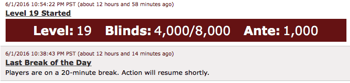 The $3K was a smaller field, as well, though that meant even more concentration of big names to cover, and one issue we found ourselves with was a too-expansive list of stacks to track. Chino Rheem, Jason Somerville, Justin Bonomo (runner up in the $1.5K HORSE), Hellmuth, Ho, David Chiu, Robert Mizrachi just off his Stud bracelet, etc. No dinner break on Day 1 and we wrapped up around 2:30am. Monday. There was a lot of non-poker emotion around, as it was Sunday afternoon that Ryan Laplante talked about the Orlando shooting—which had happened early Sunday morning—at his bracelet ceremony.