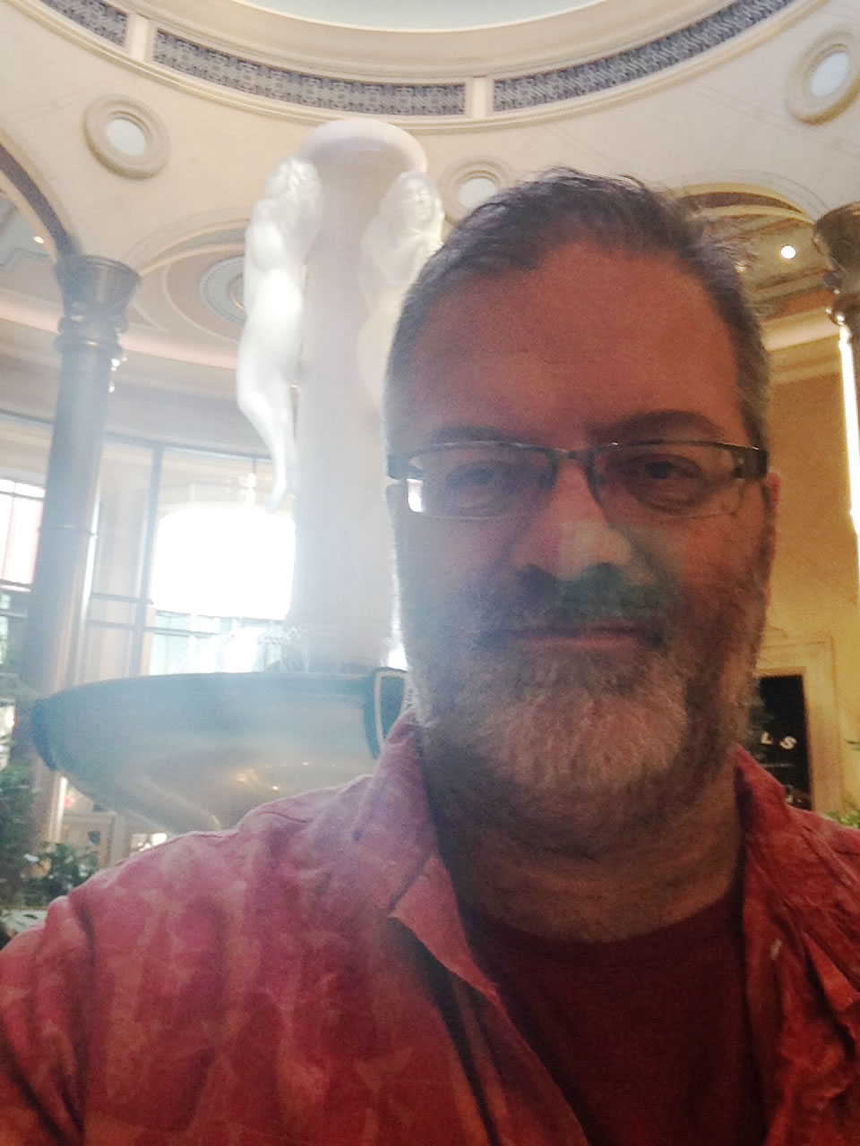 Slept the sleep of the dead for about four hours then woke up, talked to Barbara at home and the guys in the house, then had to start getting ready to head back to the Rio. It’s about 12 miles. I use an off-brand route that—except for a crossing over US95—avoids the freeways and is pretty much a straight shot with just a couple of turns from Flamingo and onto the street that runs by the subdivision gates. The one downfall being that the first night I drove the last leg, I screeched to a halt at two stop signs that were almost impossible to see in time on unlit sections of a four-lane road road.