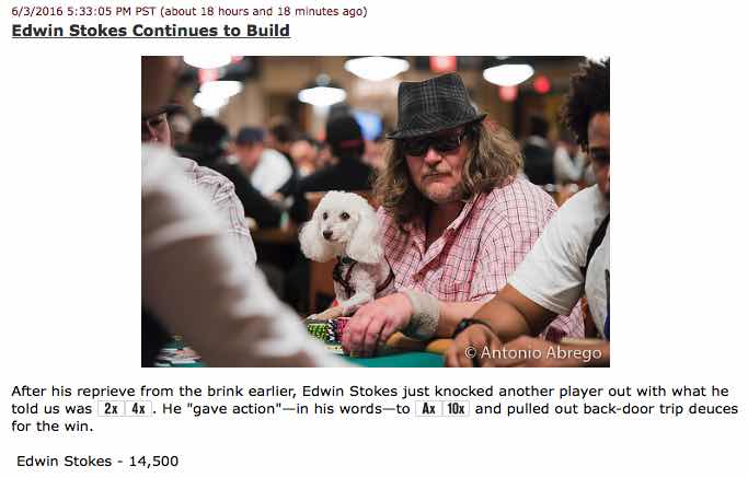I get to work doing chip counts, looking for big names, and writing up some hands. Run across a guy early on who’s a “character” that I follow through the rest of the night off and on.