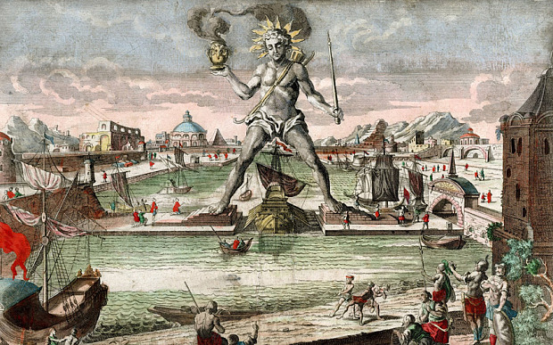 You sort of have to wonder what the artist was thinking when he depicted the Colossus as just barely large enough to admit a ship into the harbor of Rhodes. Was it a commentary on his opinion of engineers that the statue is shown with nearly zero tolerance to the sides of the yard? Or to the top of the mast itself, which nearly spikes the Colossus’s nether regions? Maybe that was the whole point of doing the painting, some sort of inside joke where an artist can slip a titillating concept into a work that’s supposedly about one of the Seven Wonders of the Classical World.