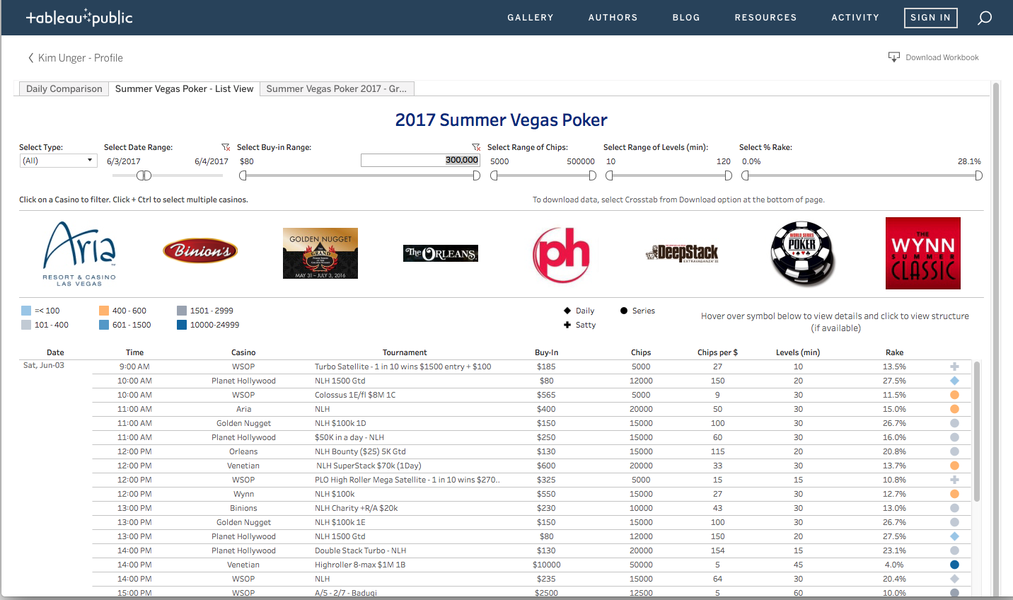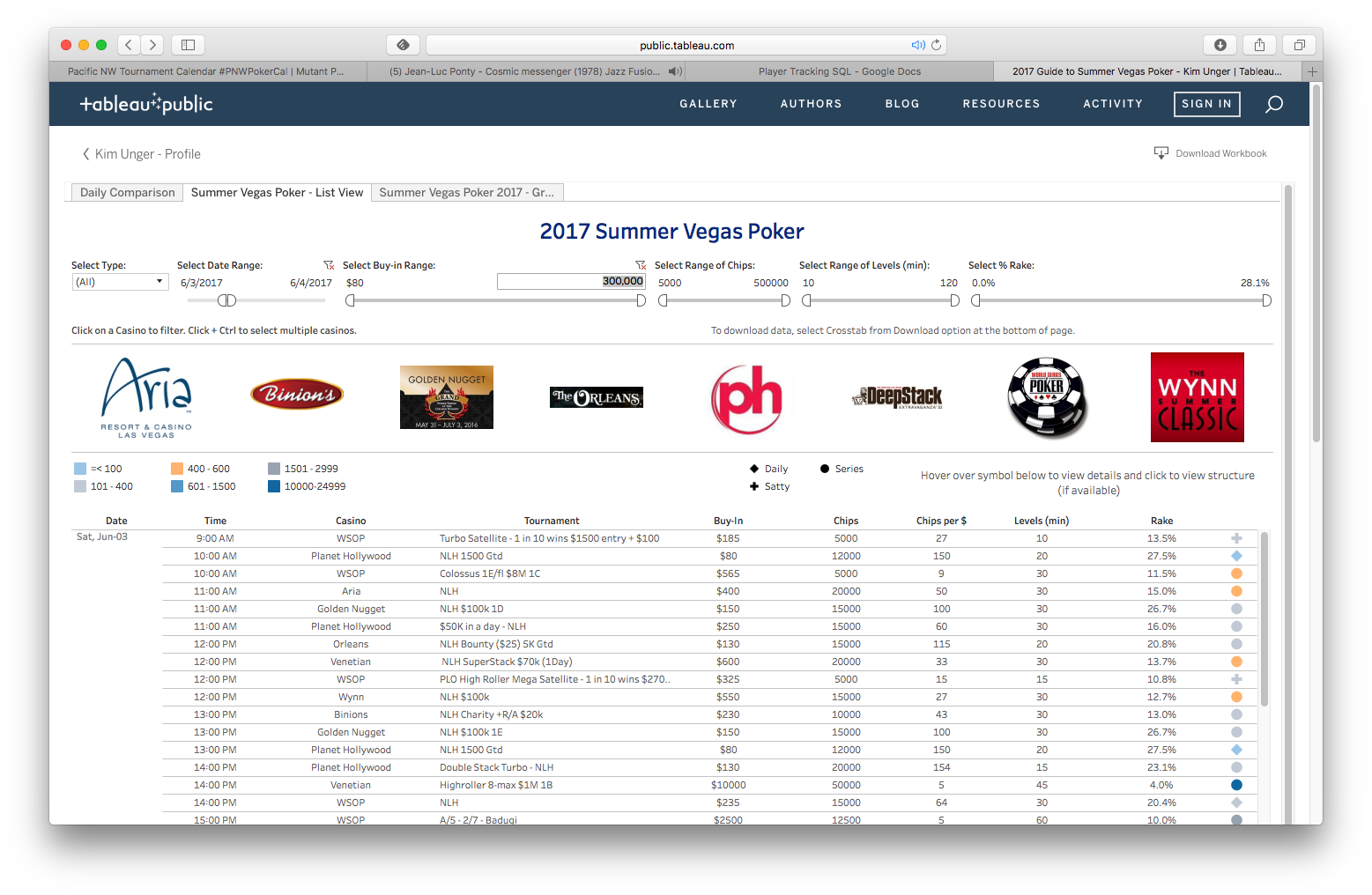 You can filter the schedule by type of tournament (daily, satellite, series), by date, buyin (althogh this could use some refinement), how many chups, level length, and rake percentage, as well as venue.