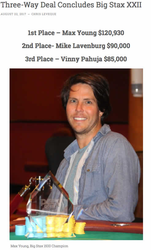 - The Venetian Deepstack Extravaganza 3.5 starts tomorrow with four weeks of events. The big early event is an $800 buyin 8-Max with a $200K GTD and there are four smaller buyin events with six-figure guarantees.