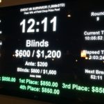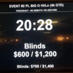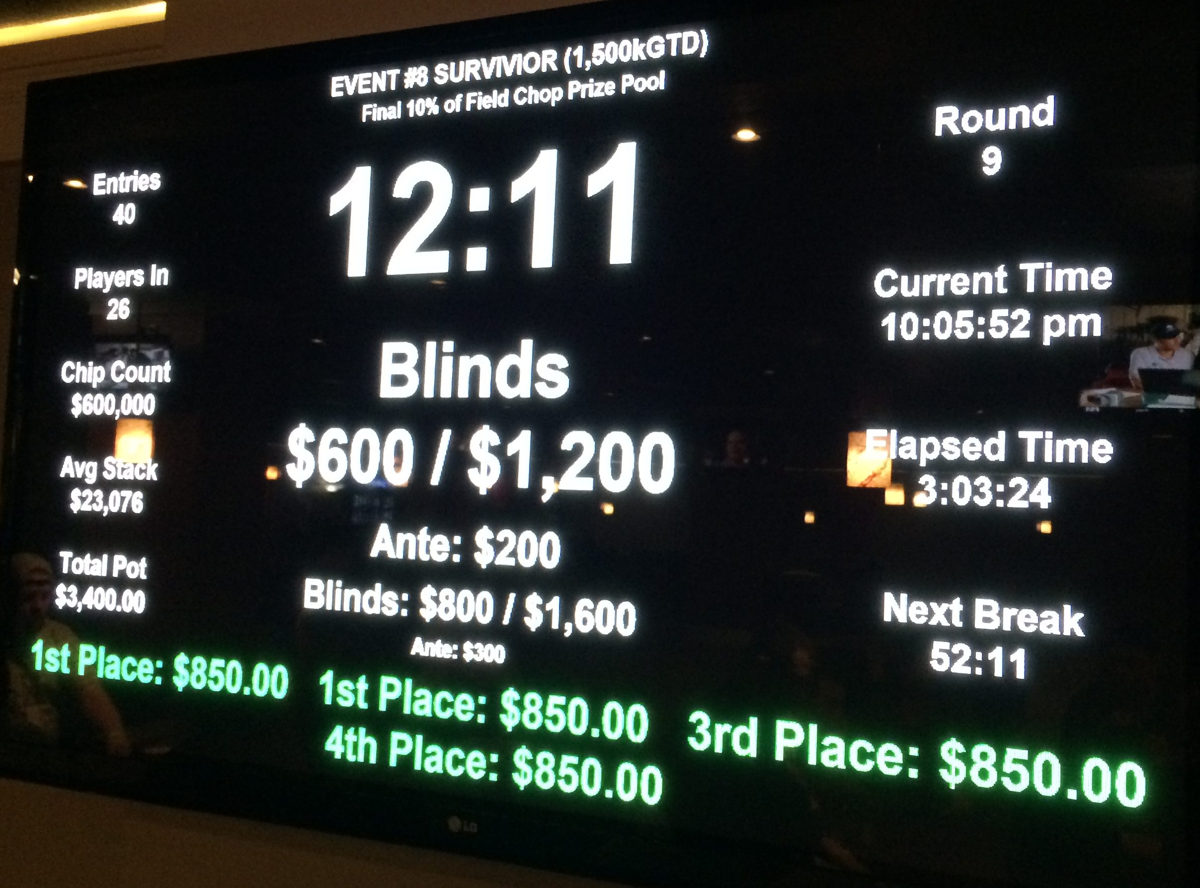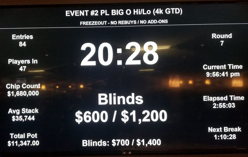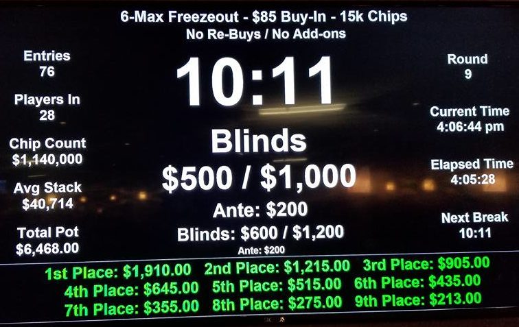 I started the tournament as Player 9, and we were six-handed for the first eight hands of the tournament as other players joined up. By the time Carlos joined our table on hand 13 (as the result of table balancing when a third table was created), we’d been up to nine players, but were back down to six. Carlos (Player 13) came in with almost a full starting stack of 2,500; I’d already been up to 2,800, then lost 900 on a draw to Broadway and the second nut flush (neither of which came in) in the previous hand.