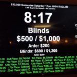The next hand, Carlos had 5♦ 5♥ in SB. UTG opened to 140, getting a call from 7♣ 4♣ (Player 17 on the button, with almost 72bb at the new 30/60 level). Carlos folded his pair. The flop came 8♥ 2♠ 4♠ and UTG bet 210 on the overpair, getting a call. UTG (Player 14) continued for another 410 on the 6♦ turn, then check-snap-called all in on the T♥ river. The two players essentially swapped chip counts.
