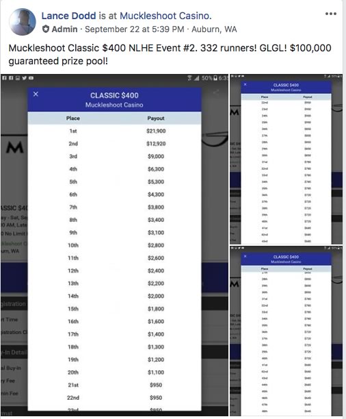 - At the Muckleshoot Fall Classic there’s a satellite tonight (Wednesday) for $1,750 in buyins (7pm, 190 entry). Thursday is a $200 entry for the only non-hold’em event: $15K GTD O8. Friday is another $400 buyin $100K GTD. Saturday is Day 1 for the $750 buyin $150K GTD Main Event. The last event on Sunday is a $40K GTD NLHE Shootout.