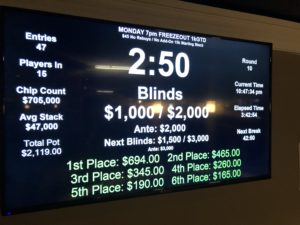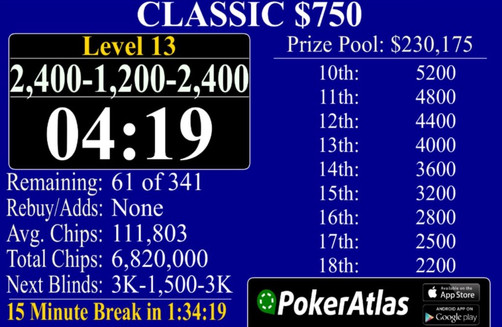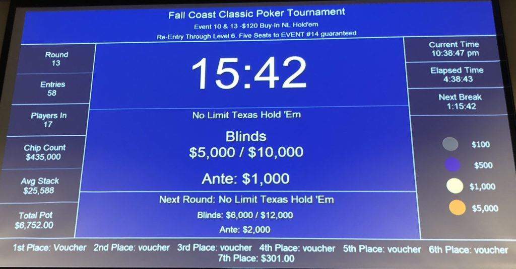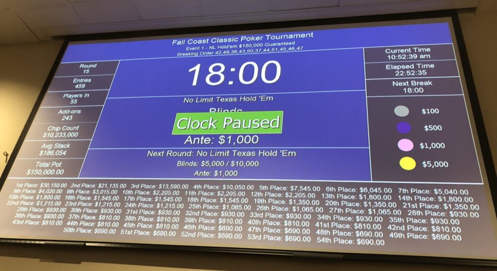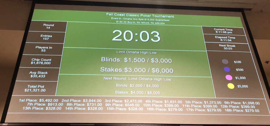 Muckleshoot Fall Poker Classic Main Event clock via TableCaptain software from PokerAtlas.com