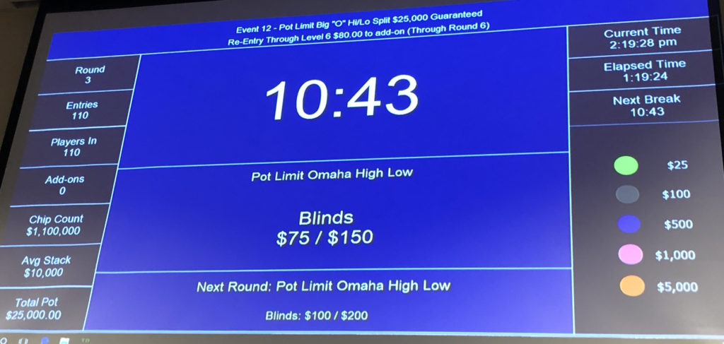 Tuesday at 11am things slow down a little, with a $25K GTD NLHE Seniors. For players in the 50+ age category, the buyin is $110 (10K), $10 fee, $10 dealer appreciation (2K). Re-entry for six levels but no addon.