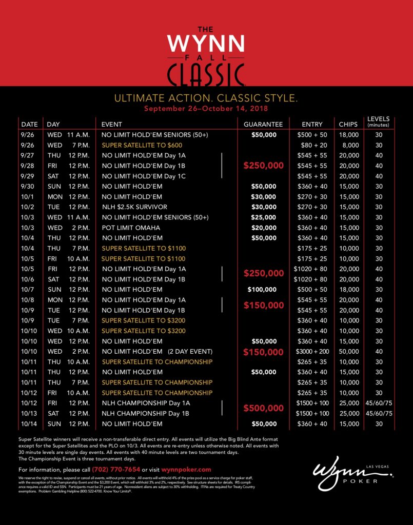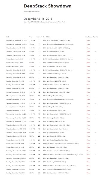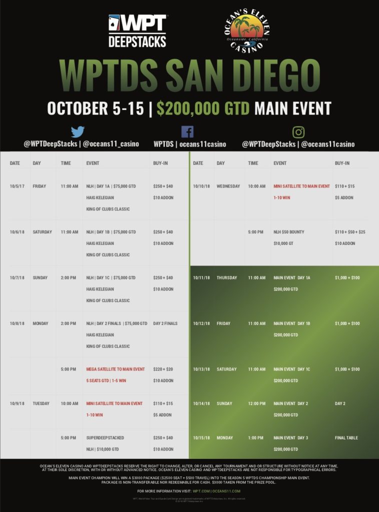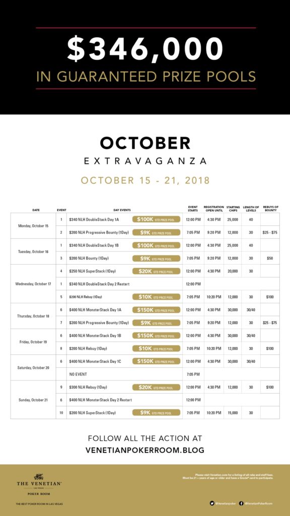 The $200K GTD Final Event starts at noon the same day (with Day 2 on Sunday). You get 30K in chips for your $525 buyin and $50 fee, another 10K in chips for the $25 addon, and 30K for the $200 addon available after registration closes at the end of level 8. There is no reentry for this tournament!