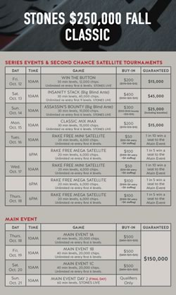 Friday evening at 6pm is the Final Event 20-Seat GTD Mega Satellite. $140 buyin (10K chips), $10 entry fee, $10 dealer appreciation (2K chips). payouts are vouchers for $575 against the Final Event buyin.