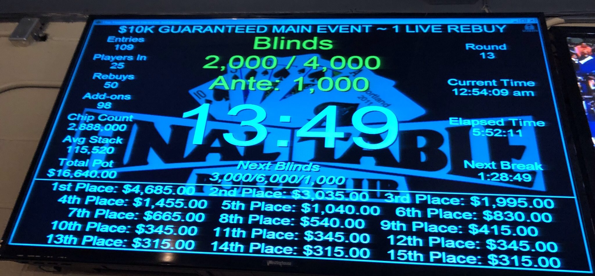Ran two more $2 Jackpots after dinner. In the first ($4 payout), the other two players got into it in the first two hands, and we lost the first player on hand three. I was behind in chips on the last hand with T♣ 9♥ and called a raise, turned top pair, then shoved but lost to 2♠ 9♦ as he’d flopped the deuce..
