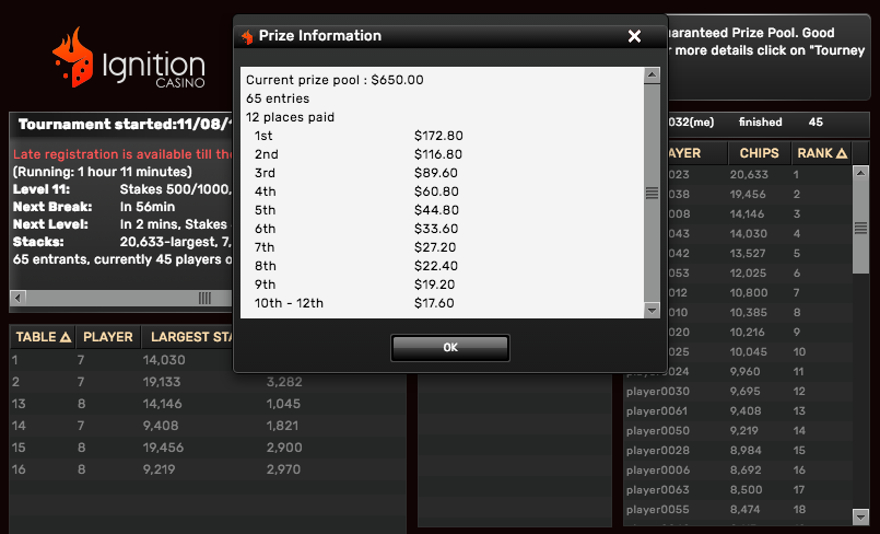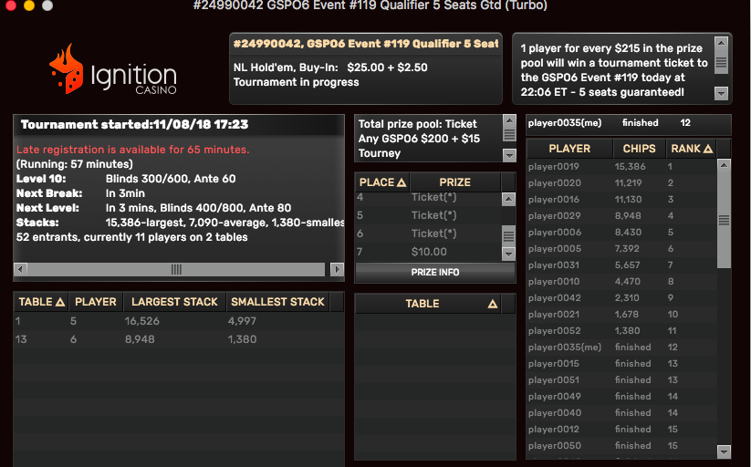 Played a satellite for Ignition Casino GSPO #119 $50K GTD NLHE High Roller. There were five tickets guaranteed, six tickets were paid out, and I made it to 12th before my re-shove with nines was called by jacks in the small blind.
