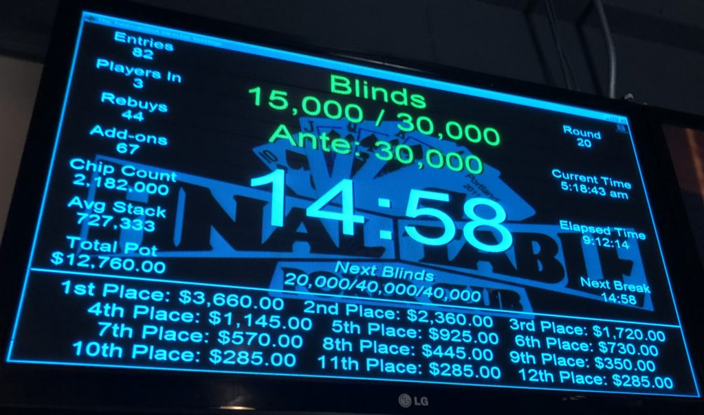 Friday night at publication time, I was still in the Final Table $10K GTD NLHE.