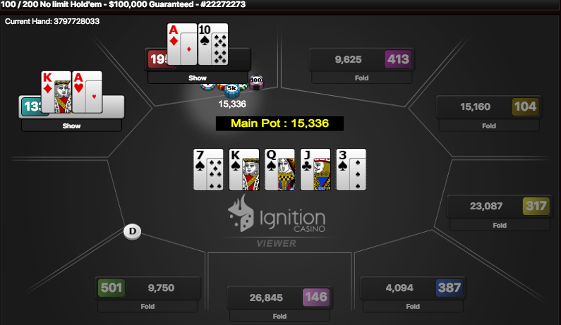 Family obligations have tended to keep me from playing the Ignition Casino $100K GTD NLHE on Sundays. There’s stuff to do to get the house ready for our Sunday family dinner—even though I’m, thankfully, not doing the cooking—and I don’t like to buy into a tournament of that size late, or be playing it while we’ve got company, even if it’s company that’s here every week.