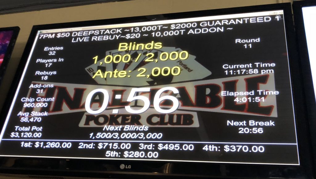 Played a satellite for the Ignition Casino 12 Days of Turbo Wrap Up #61 NLHE and only got 20th place, the jumped into the game directly. I lost some ground early on with a series of pairs that didn’t go anywhere (although I could see from the rabbit cam feature that the pair of sevens I folded on the flop with two overs would have made a set on the turn, grrrr…).