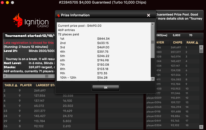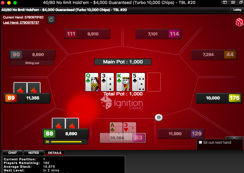 Played the Ignition Casino $4K GTD NLHE Turbo after I got home from a family thing this evening. Right off the bat, I got lucky and managed to not only hit two sets but get two players to stack off against with with top-top. I was on top of the leaderboard, ma! ~500 blinds is a nice place to be, even in a turbo.