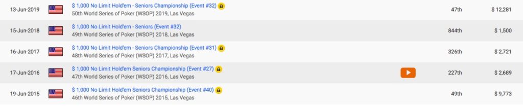 WSOP #39 NLHE Super Seniors (OMFG, just three more years…) got 2650 entries, Puyallup’s Loyd Stedge made it to 22nd. He makes the long jump to #1506 with his second and largest recorded cash.