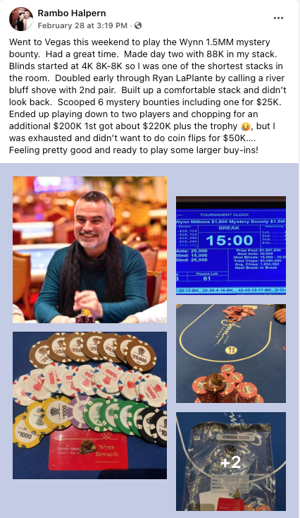 Coming in 13th at the Wynn Millions $1.5M GTD NLHE Mystery Bounty, Beaverton’s Anthony An took down their biggest-ever cash and rose over four hundred places to #983. And it was Rambo Halpern — former owner of one of the first poker clubs I played in — who took an astounding 2nd-place (plus some bounties) in the field of 2,103 that more than doubled the guarantee. It bumps him up by two hundred places, to #150 on the PNW Poker Leaderboard.
