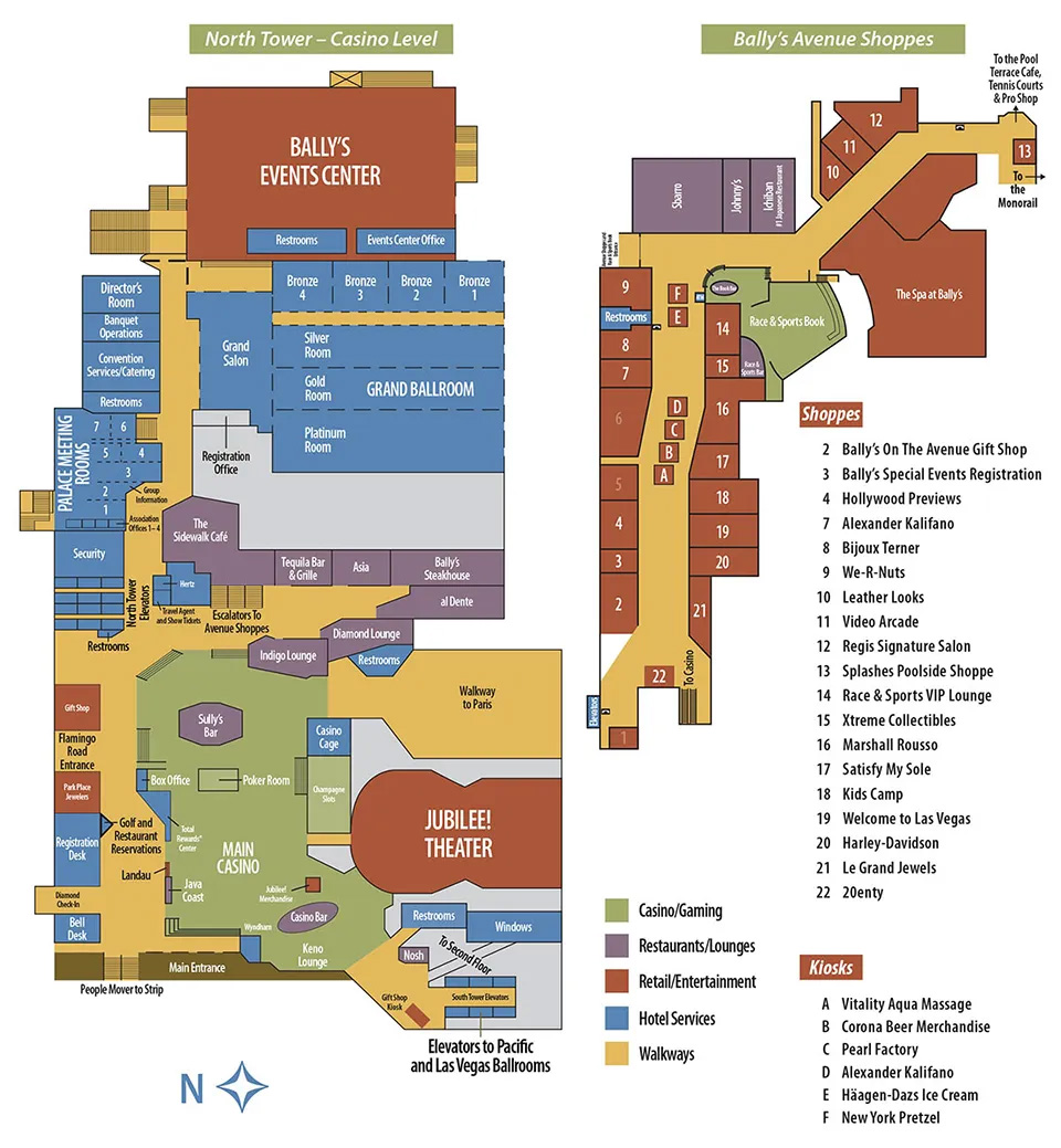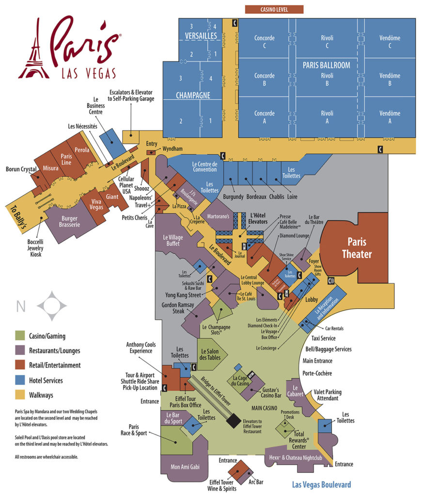 It’s kind of scary to think that we’re less than a month away from this year’s World Series of Poker. Yeah! You forgot didn’t you? It’s been nearly three years since the last summer-time WSOP, and even if you did remember, you probably were wondering why rooms at the Rio All-Suite Casino & Hotel were so damn cheap compared to last time. That’s because the WSOP isn’t there any more, stupid! This time around, the whole thing’s happening on the Strip, at Bally’s and Paris Las Vegas, and, as Firesign Theater used to say: Everything You Know Is Wrong. It’s not just that you’re not going to know where anything is any more (really, did you ever figure out which room was Brasilia and which one was Amazon?) but the people running things are going to be confused, too, so this has the potential to be a right shitshow, as they say. Anyway, here’s some maps, just in case they might help. In both cases the ballroom areas at the top of the map are on the east side of the buildings, away from the Strip.