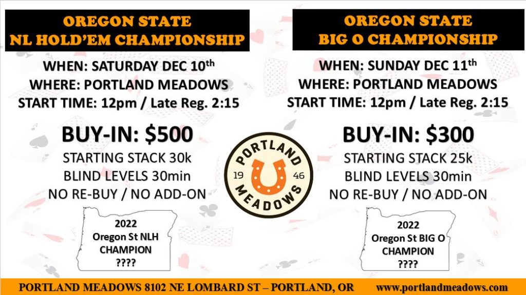 Coming up in December, Portland Meadows has NLHE and Big O Freezeout championships.